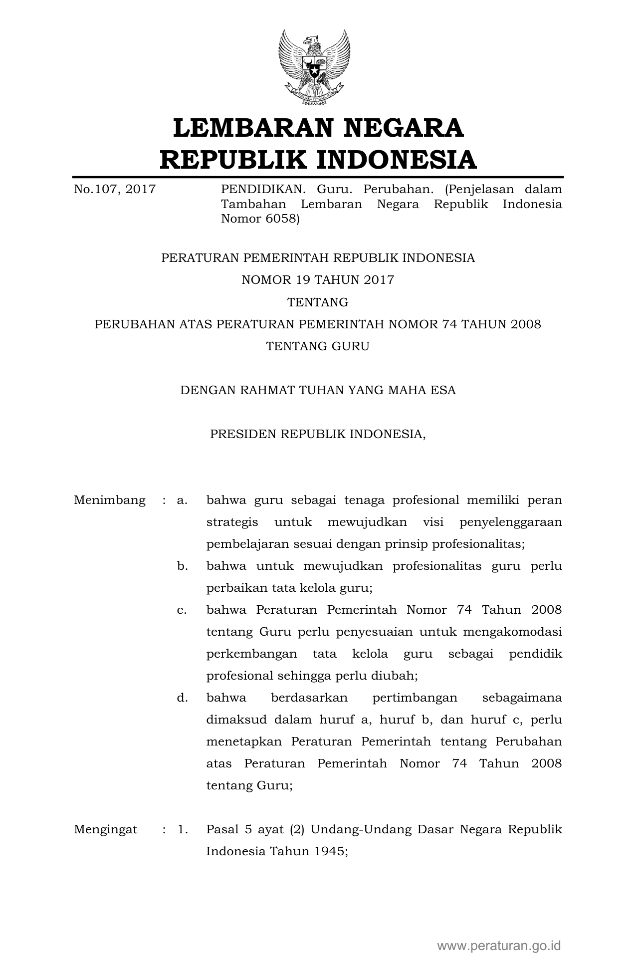 PP Nomor 19 Tahun 2017 | Peraturan Pemerintah Nomor 19 Tahun 2017 tentang Perubahan Atas Peraturan Pemerintah Nomor 74 Tahun 2008 Tentang Guru