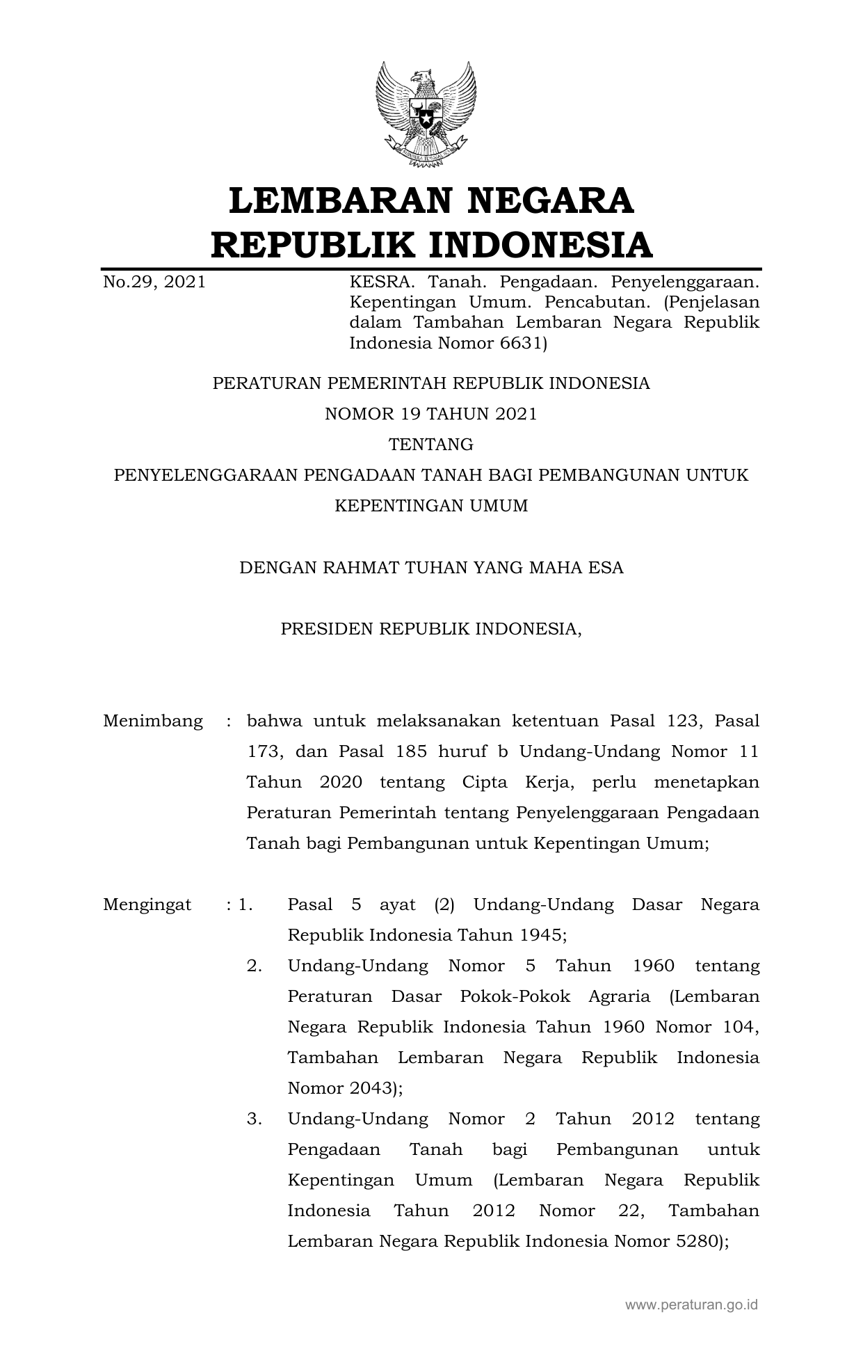 PP Nomor 19 Tahun 2021 | Peraturan Pemerintah Nomor 19 Tahun 2021 tentang PENYELENGGARAAN PENGADAAN TANAH BAGI PEMBANGUNAN UNTUK KEPENTINGAN UMUM