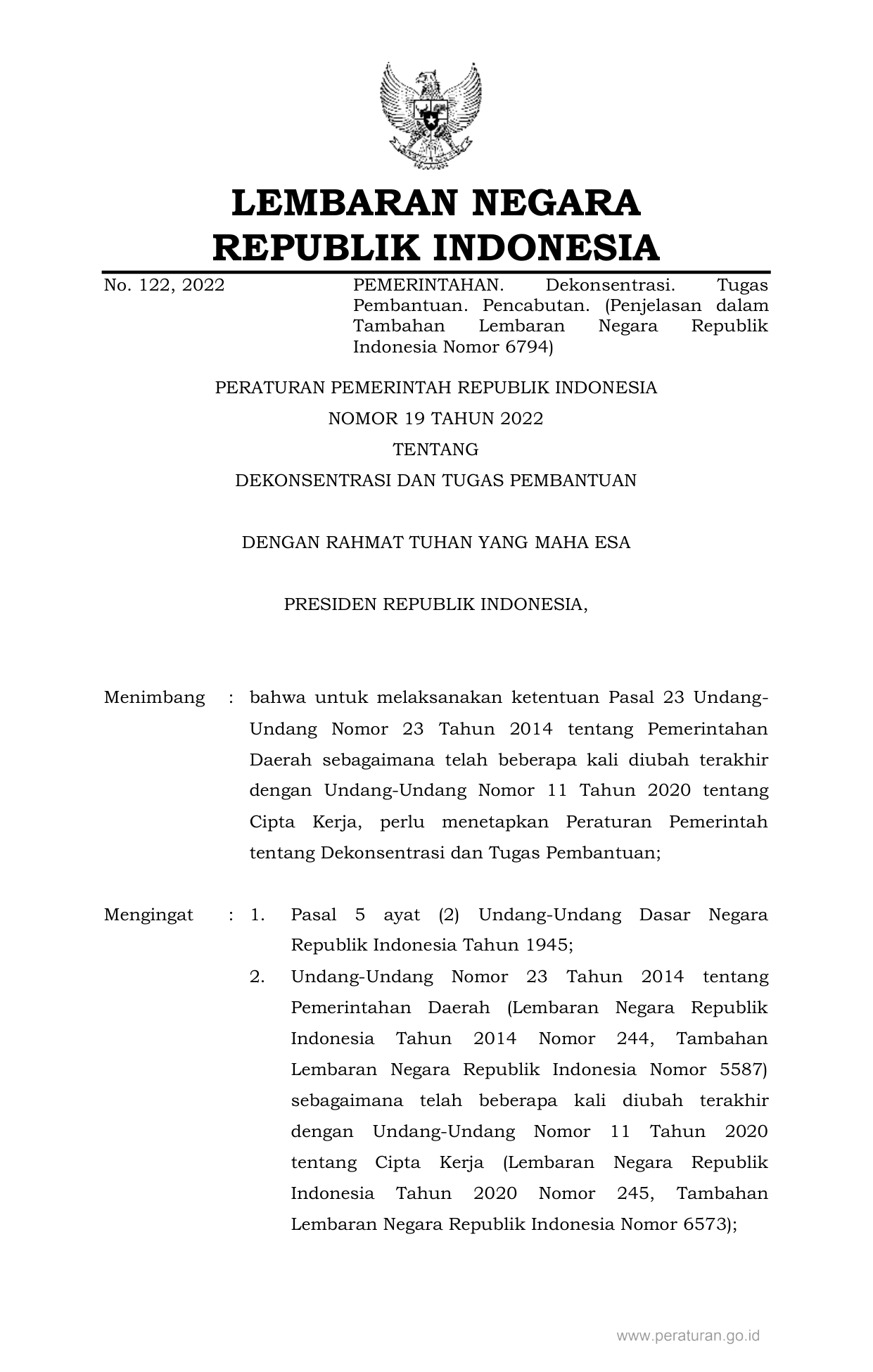 PP Nomor 19 Tahun 2022 | Peraturan Pemerintah Nomor 19 Tahun 2022 tentang DEKONSENTRASI DAN TUGAS PEMBANTUAN