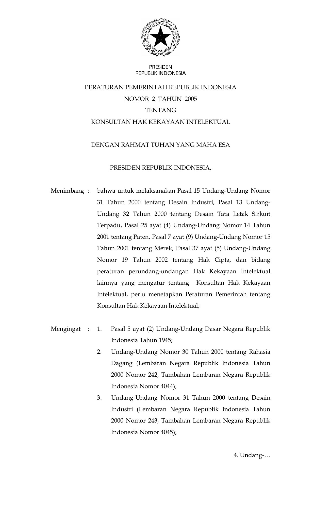 PP Nomor 2 Tahun 2005 | Peraturan Pemerintah Nomor 2 Tahun 2005 tentang KONSULTAN HAK KEKAYAAN INTELEKTUAL