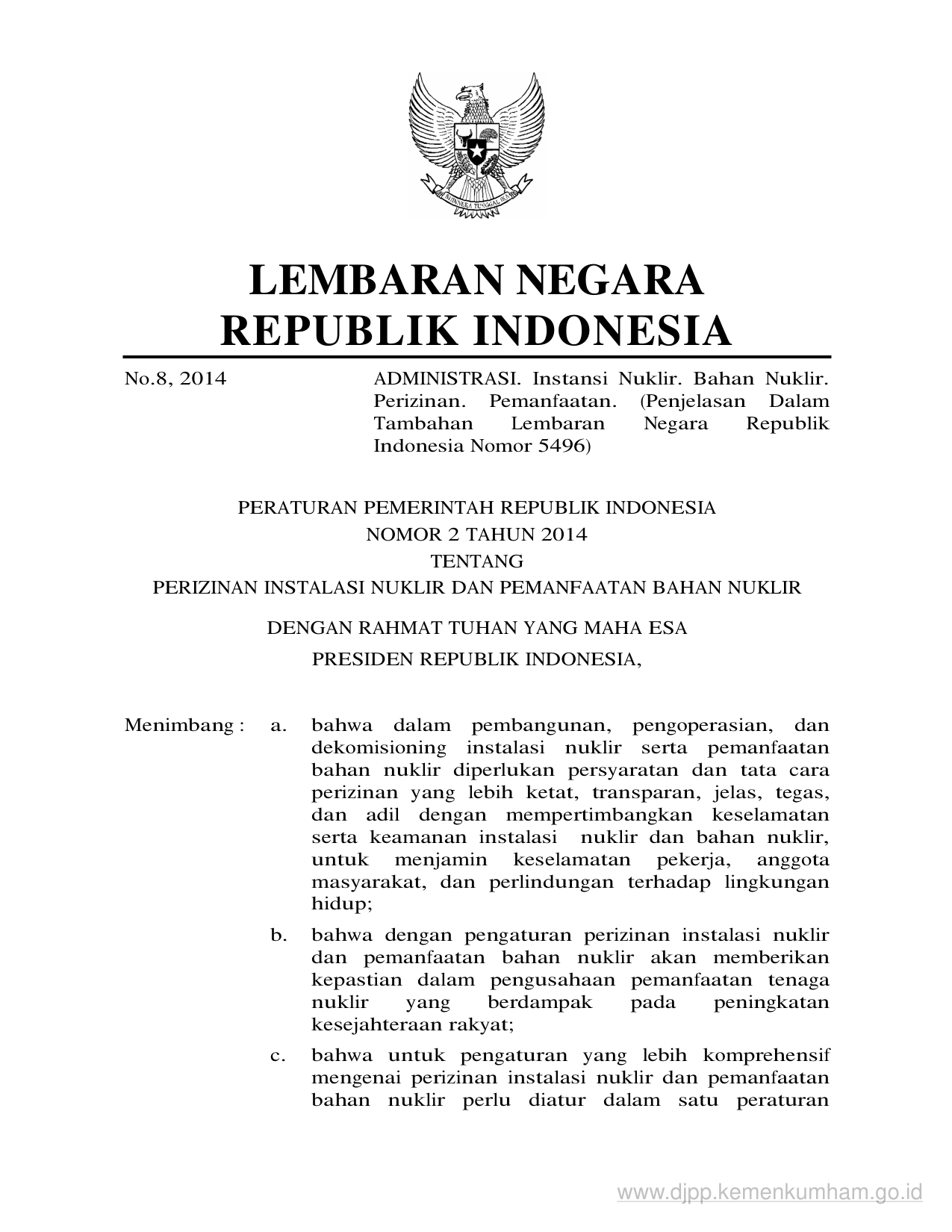 PP Nomor 2 Tahun 2014 | Peraturan Pemerintah Nomor 2 Tahun 2014 tentang PERIZINAN INSTALASI NUKLIR DAN PEMANFAATAN BAHAN NUKLIR