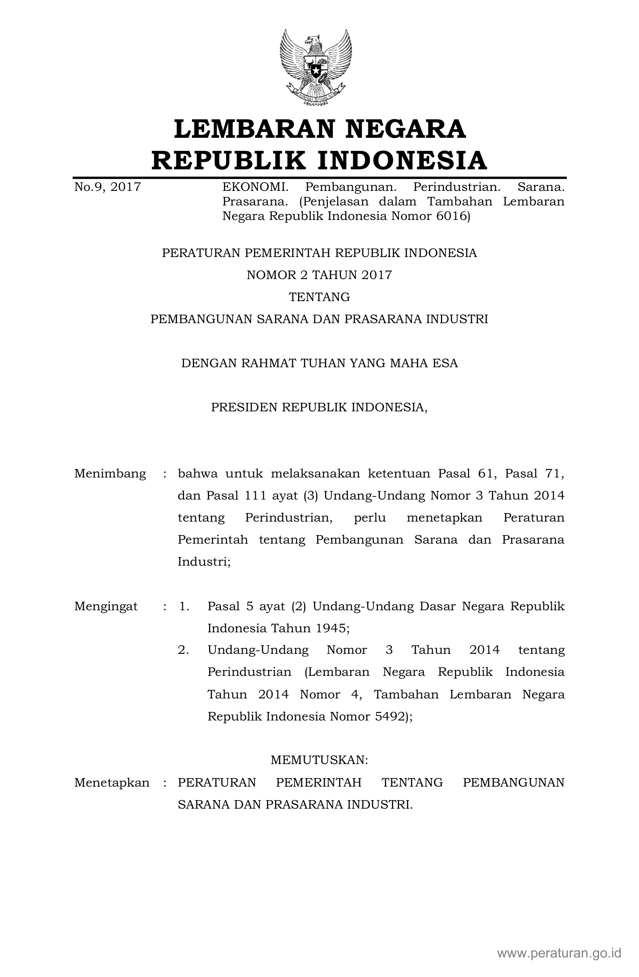PP Nomor 2 Tahun 2017 | Peraturan Pemerintah Nomor 2 Tahun 2017 tentang Pembangunan Sarana Dan Prasarana Industri