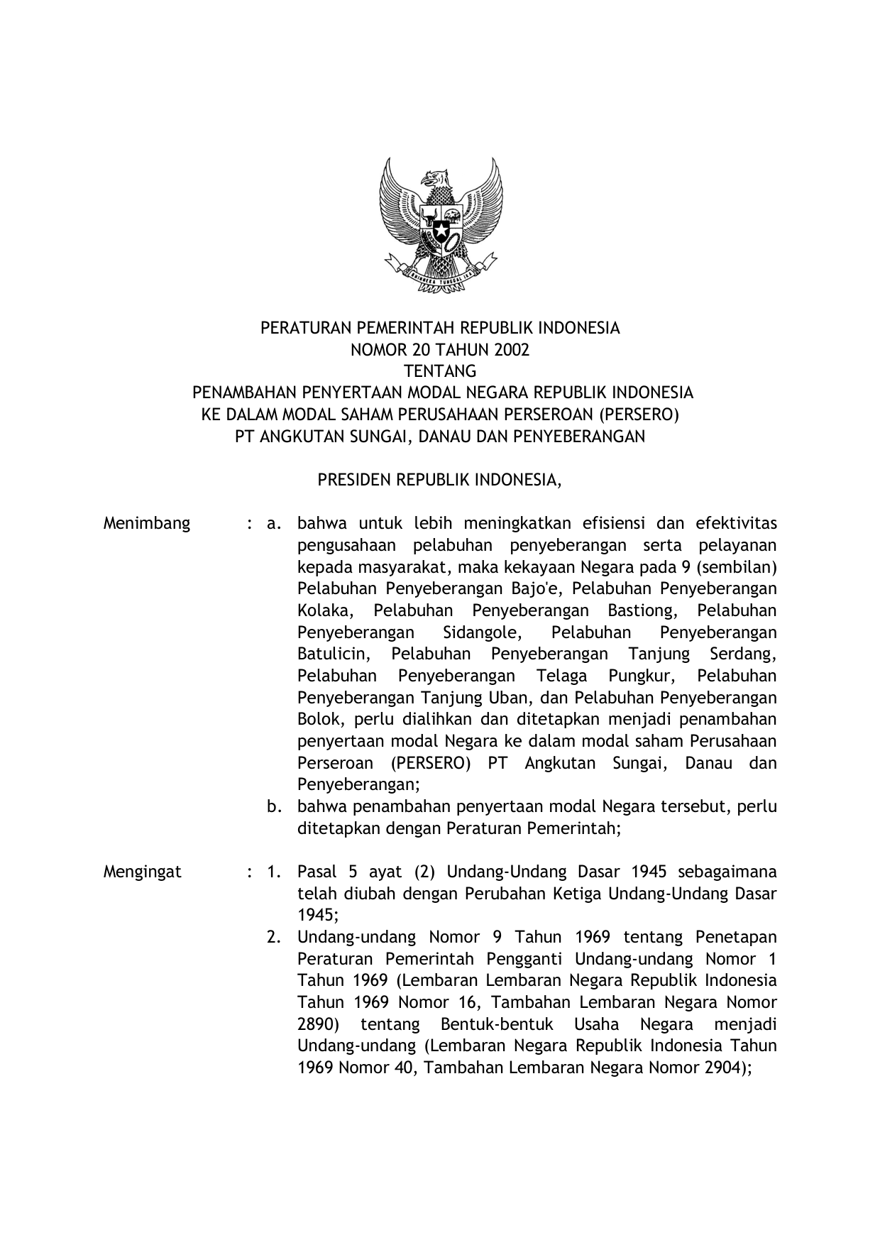 PP Nomor 20 Tahun 2002 | Peraturan Pemerintah Nomor 20 Tahun 2002 tentang PENAMBAHAN PENYERTAAN MODAL NEGARA RI KE DALAM MODAL SAHAM PERUSAHAAN PERSEROAN (PERSERO) PT ANGKUTAN SUNGAI, DANAU DAN PENYEBERANGAN