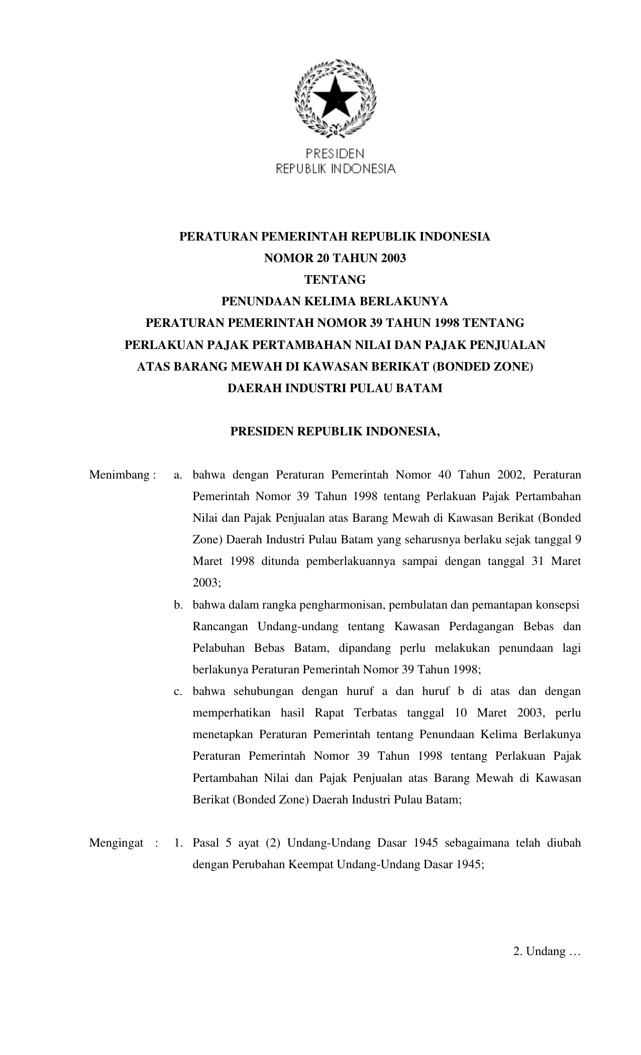 PP Nomor 20 Tahun 2003 | Peraturan Pemerintah Nomor 20 Tahun 2003 tentang PENUNDAAN KELIMA BERLAKUNYA PP 39-1998 TENTANG PERLAKUAN PAJAK PERTAMBAHAN NILAI DAN PAJAK PENJUALAN ATAS BARANG MEWAH DI KAWASAN BERIKAT (BONDED ZONE) DAERAH INDUSTRI PULAU BATAM