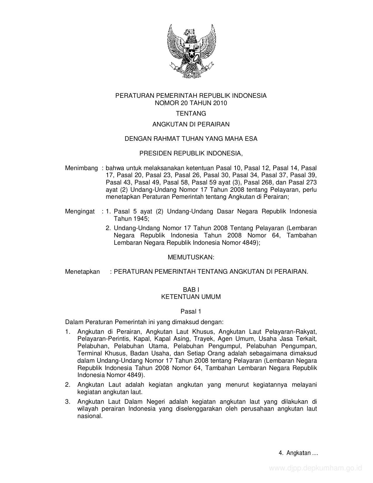 PP Nomor 20 Tahun 2010 | Peraturan Pemerintah Nomor 20 Tahun 2010 tentang ANGKUTAN DI PERAIRAN