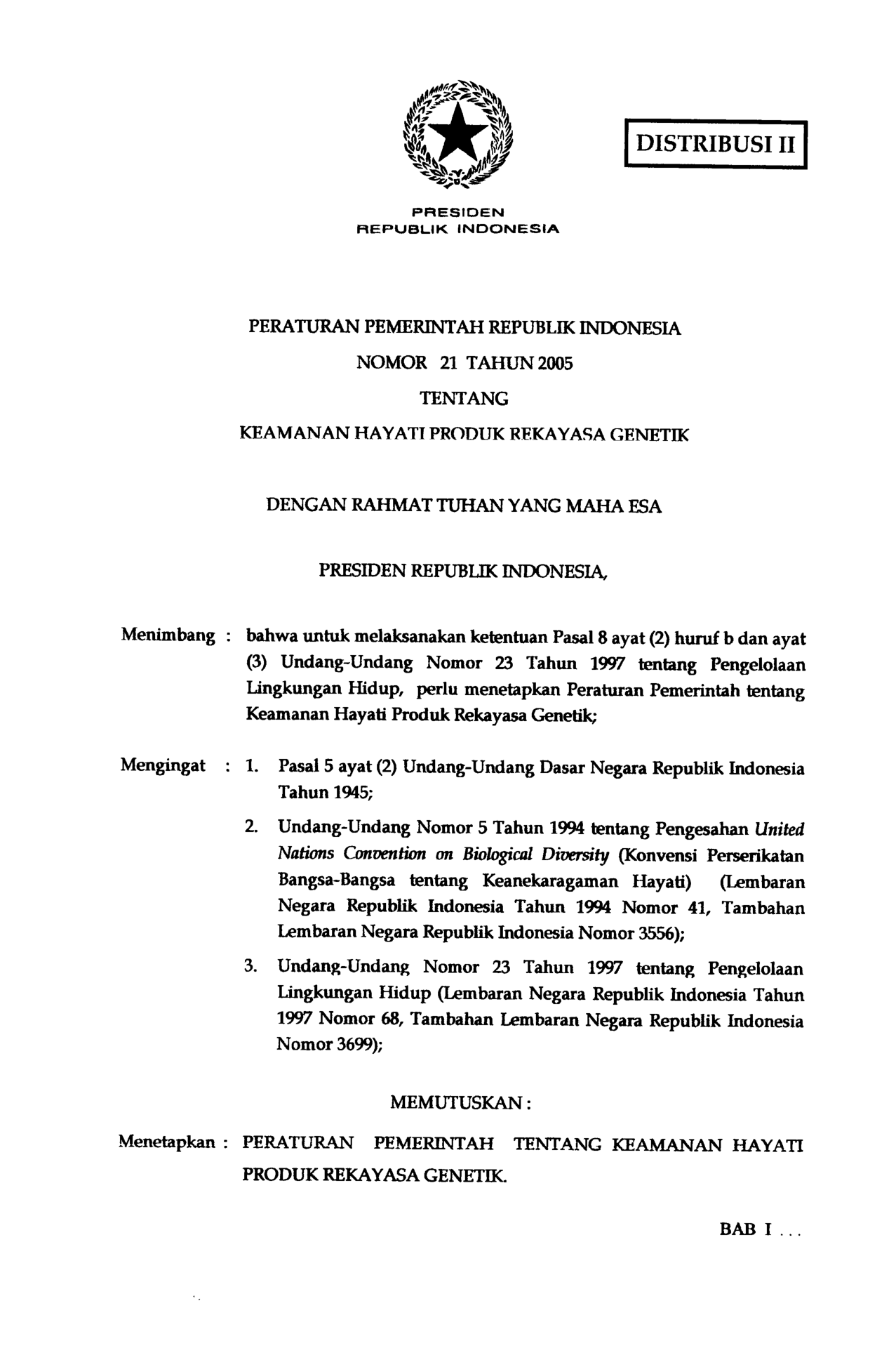 PP Nomor 21 Tahun 2005 | Peraturan Pemerintah Nomor 21 Tahun 2005 tentang KEAMANAN HAYATI PRODUK REKAYASA GENETIK