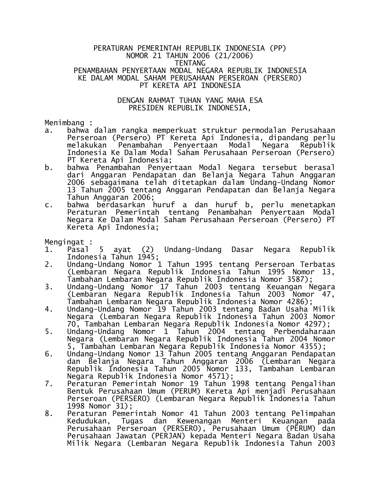 PP Nomor 21 Tahun 2006 | Peraturan Pemerintah Nomor 21 Tahun 2006 tentang PENAMBAHAN PENYERTAAN MODAL NEGARA RI KE DALAM MODAL SAHAM PERUSAHAAN PERSEROAN (PERSERO) PT KERETA API INDONESIA