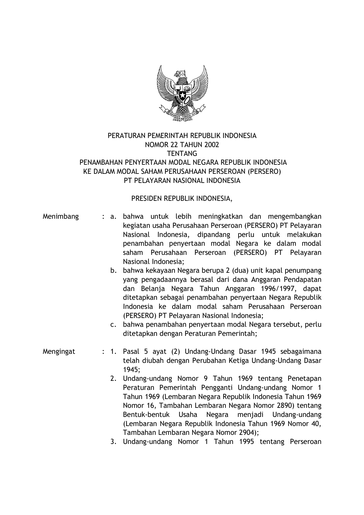 PP Nomor 22 Tahun 2002 | Peraturan Pemerintah Nomor 22 Tahun 2002 tentang PENAMBAHAN PENYERTAAN MODAL NEGARA RI KE DALAM MODAL SAHAM PERUSAHAAN PERSEROAN (PERSERO) PT PELAYARAN NASIONAL INDONESIA