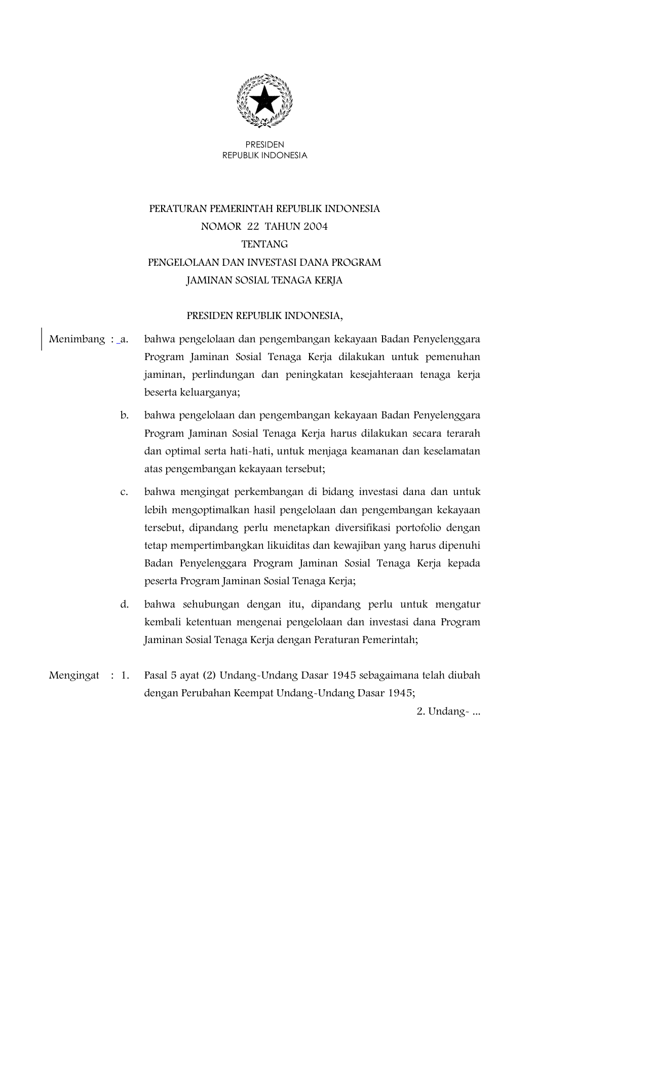 PP Nomor 22 Tahun 2004 | Peraturan Pemerintah Nomor 22 Tahun 2004 tentang PENGELOLAAN DAN INVESTASI DANA PROGRAM JAMINAN SOSIAL TENAGA KERJA