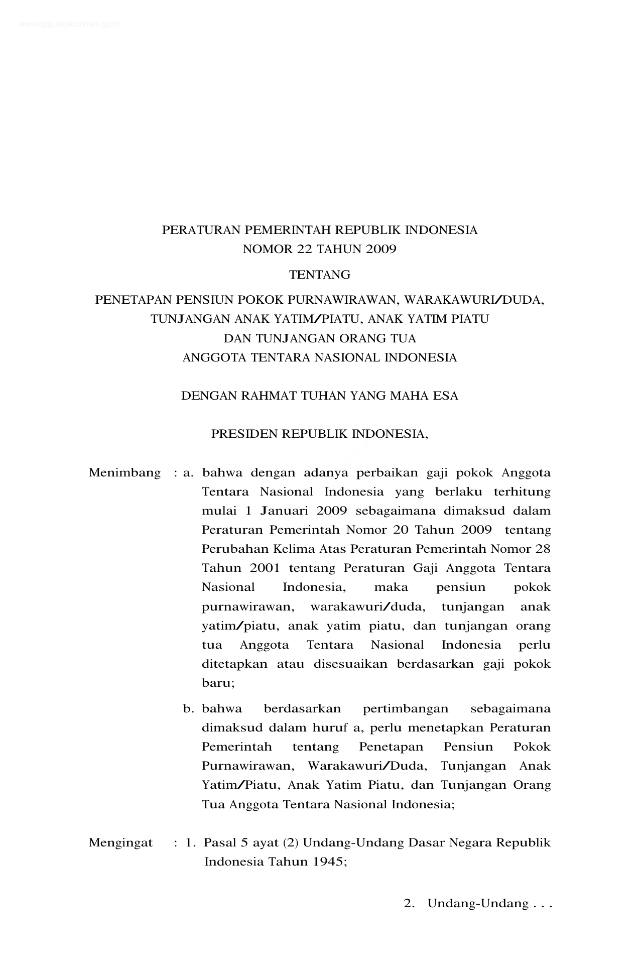 PP Nomor 22 Tahun 2009 | Peraturan Pemerintah Nomor 22 Tahun 2009 tentang PENETAPAN PENSIUN POKOK PURNAWIRAWAN, WARAKAWURI/DUDA, TUNJANGAN ANAK YATIM/PIATU, ANAK YATIM PIATU DAN TUNJANGAN ORANG TUA ANGGOTA TENTARA NASIONAL INDONESIA