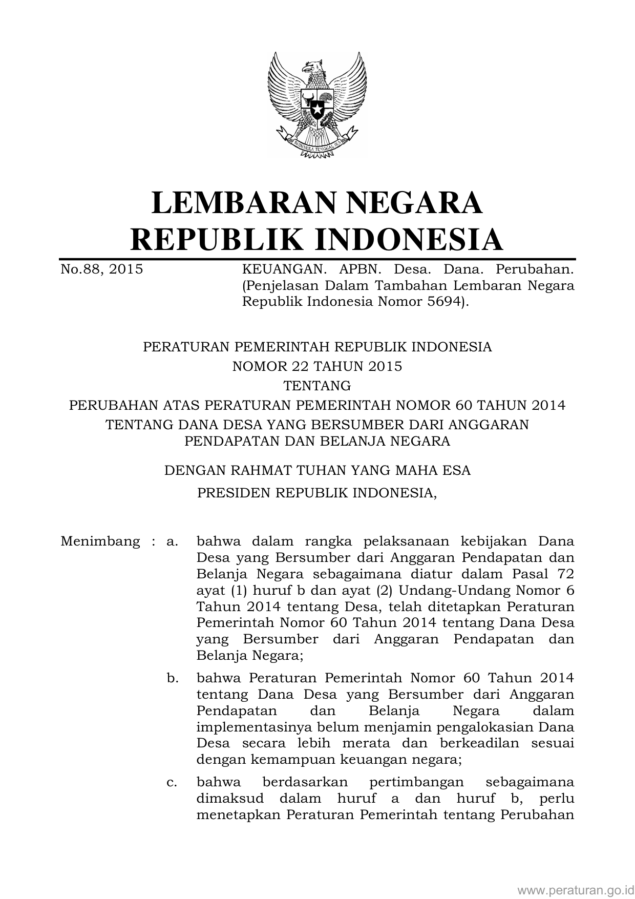 PP Nomor 22 Tahun 2015 | Peraturan Pemerintah Nomor 22 Tahun 2015 tentang PERUBAHAN ATAS PERATURAN PEMERINTAH NOMOR 60 TAHUN 2014 TENTANG DANA DESA YANG BERSUMBER DARI ANGGARAN PENDAPATAN DAN BELANJA NEGARA