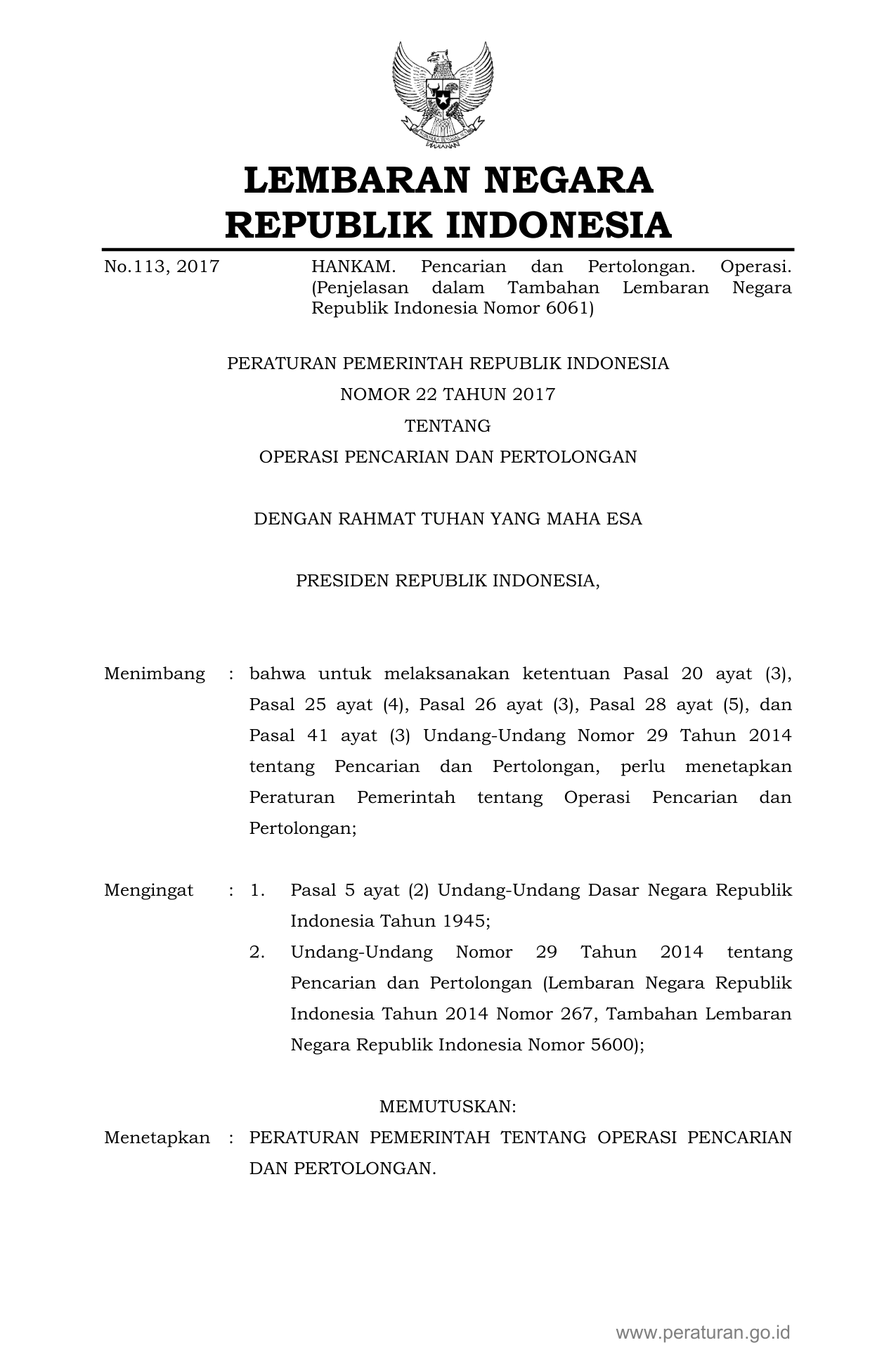 PP Nomor 22 Tahun 2017 | Peraturan Pemerintah Nomor 22 Tahun 2017 tentang Operasi Pencarian dan Pertolongan