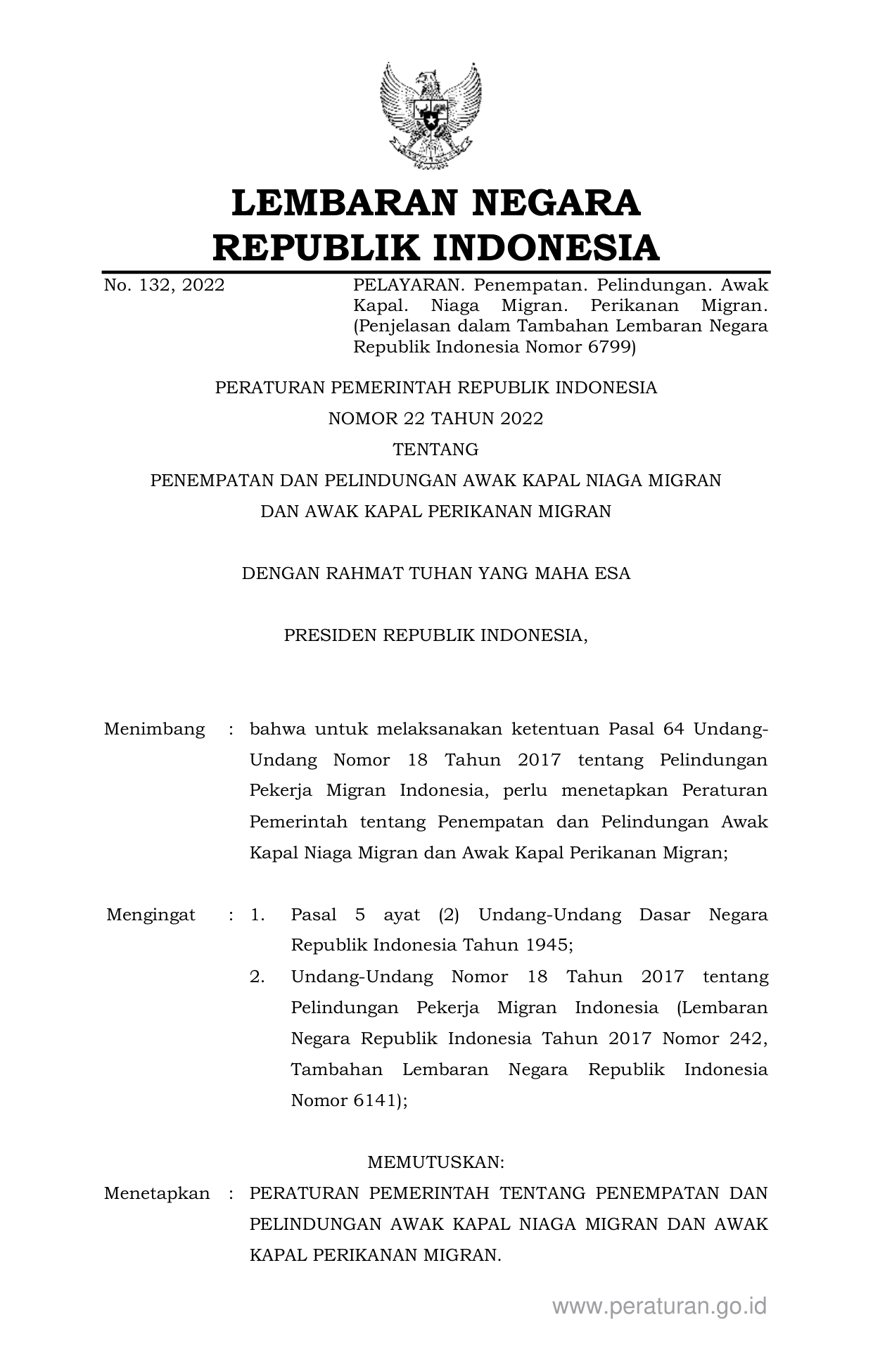 PP Nomor 22 Tahun 2022 | Peraturan Pemerintah Nomor 22 Tahun 2022 tentang PENEMPATAN DAN PELINDUNGAN AWAK KAPAL NIAGA MIGRAN DAN AWAK KAPAL PERIKANAN MIGRAN