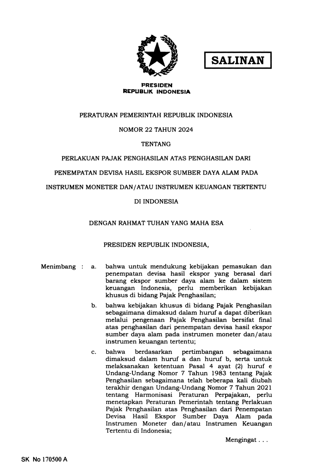 PP Nomor 22 Tahun 2024 | Peraturan Pemerintah Nomor 22 Tahun 2024 tentang PERLAKUAN PAJAK PENGHASILAN ATAS PENGHASILAN DARI PENEMPATAN DEVISA HASIL EKSPOR SUMBER DAYA ALAM PADA INSTRUMEN MONETER DAN/ATAU INSTRUMEN KEUANGAN TERTENTU