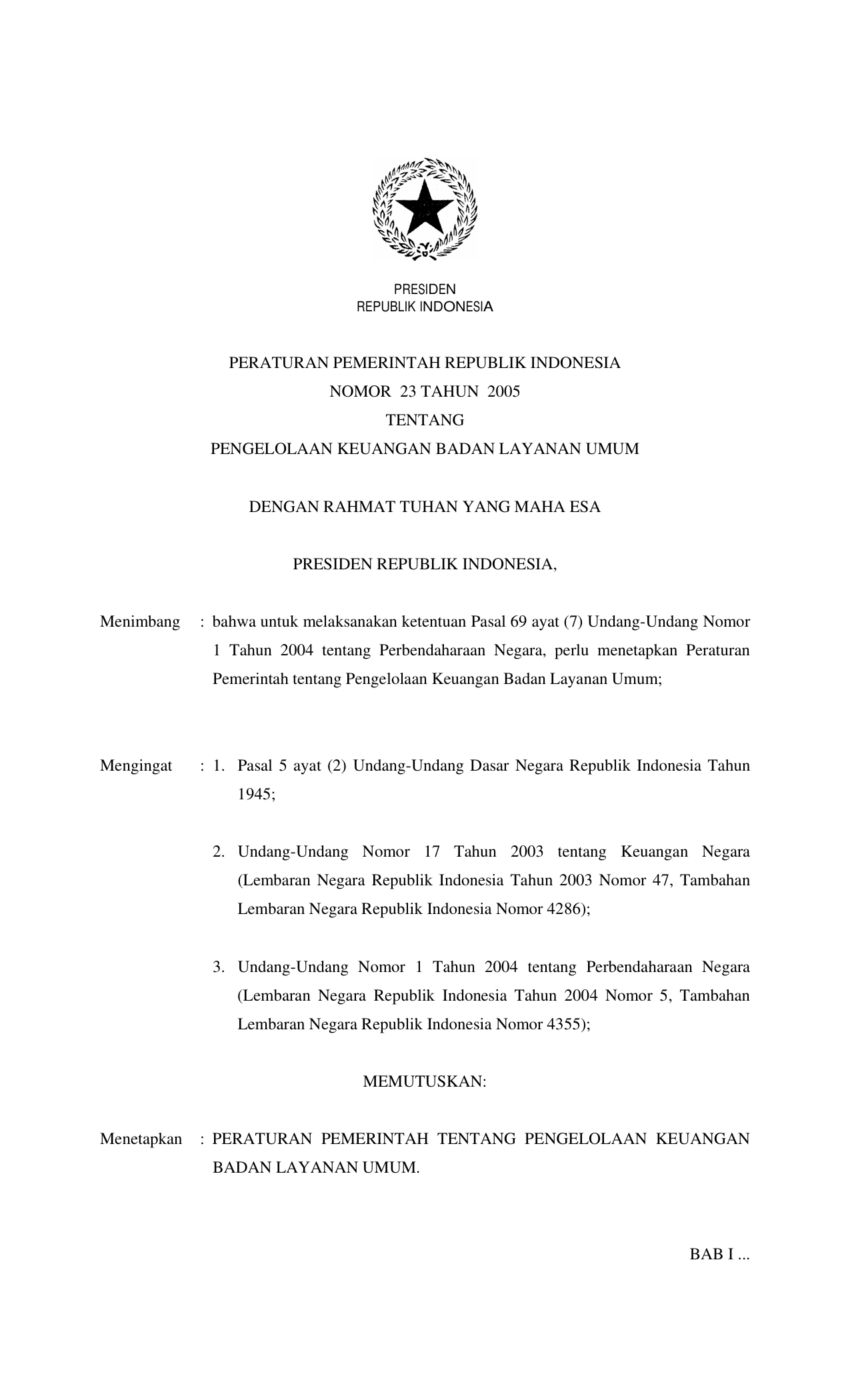 PP Nomor 23 Tahun 2005 | Peraturan Pemerintah Nomor 23 Tahun 2005 tentang PENGELOLAAN KEUANGAN BADAN LAYANAN UMUM