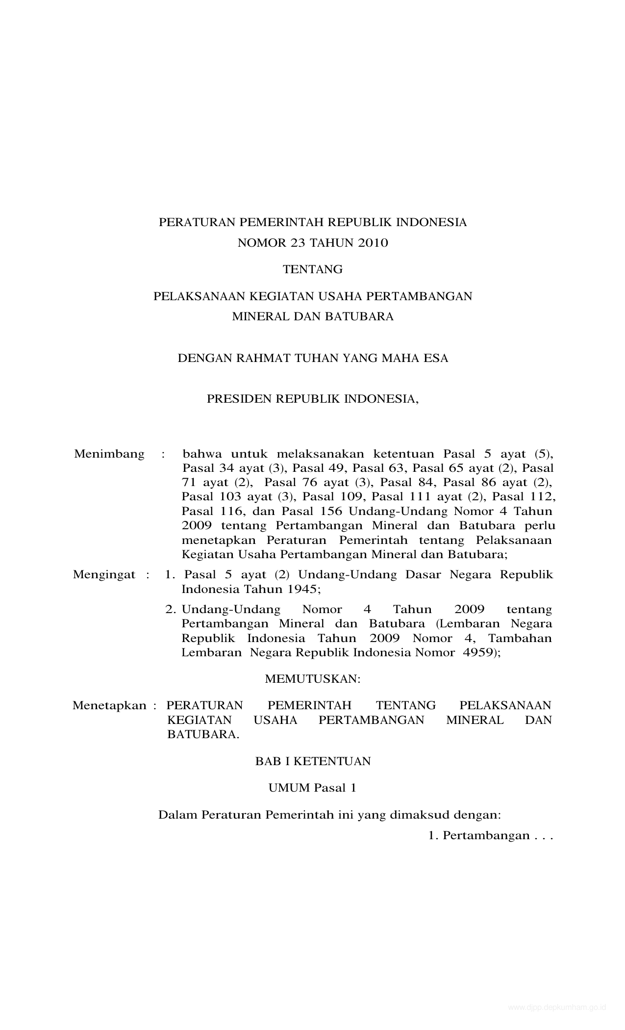 PP Nomor 23 Tahun 2010 | Peraturan Pemerintah Nomor 23 Tahun 2010 tentang PELAKSANAAN KEGIATAN USAHA PERTAMBANGAN MINERAL DAN BATU BARA