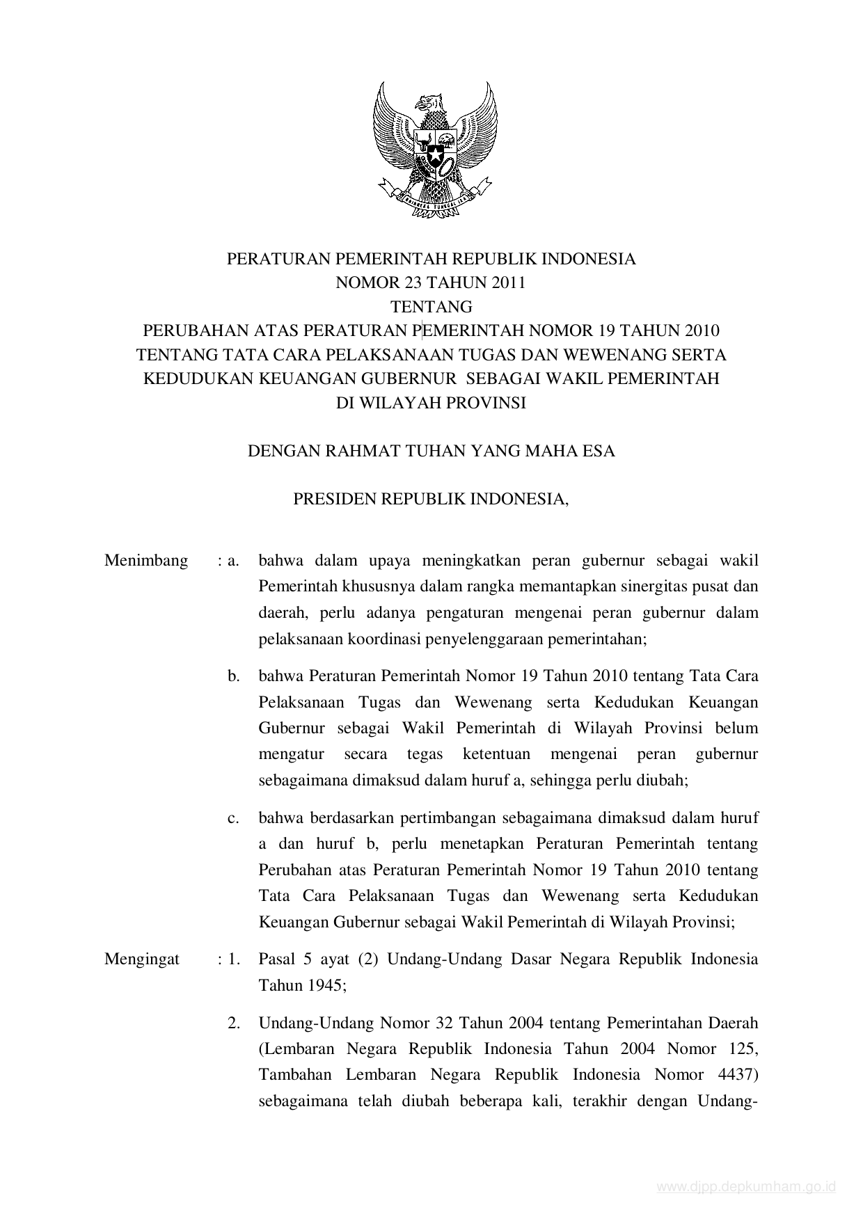 PP Nomor 23 Tahun 2011 | Peraturan Pemerintah Nomor 23 Tahun 2011 tentang PERUBAHAN ATAS PERATURAN PEMERINTAH NOMOR 19 TAHUN 2010 TENTANG TATA CARA PELAKSANAAN TUGAS DAN WEWENANG SERTA KEDUDUKAN KEUANGAN GUBERNUR SEBAGAI WAKIL PEMERINTAH DI WILAYAH PROVINSI