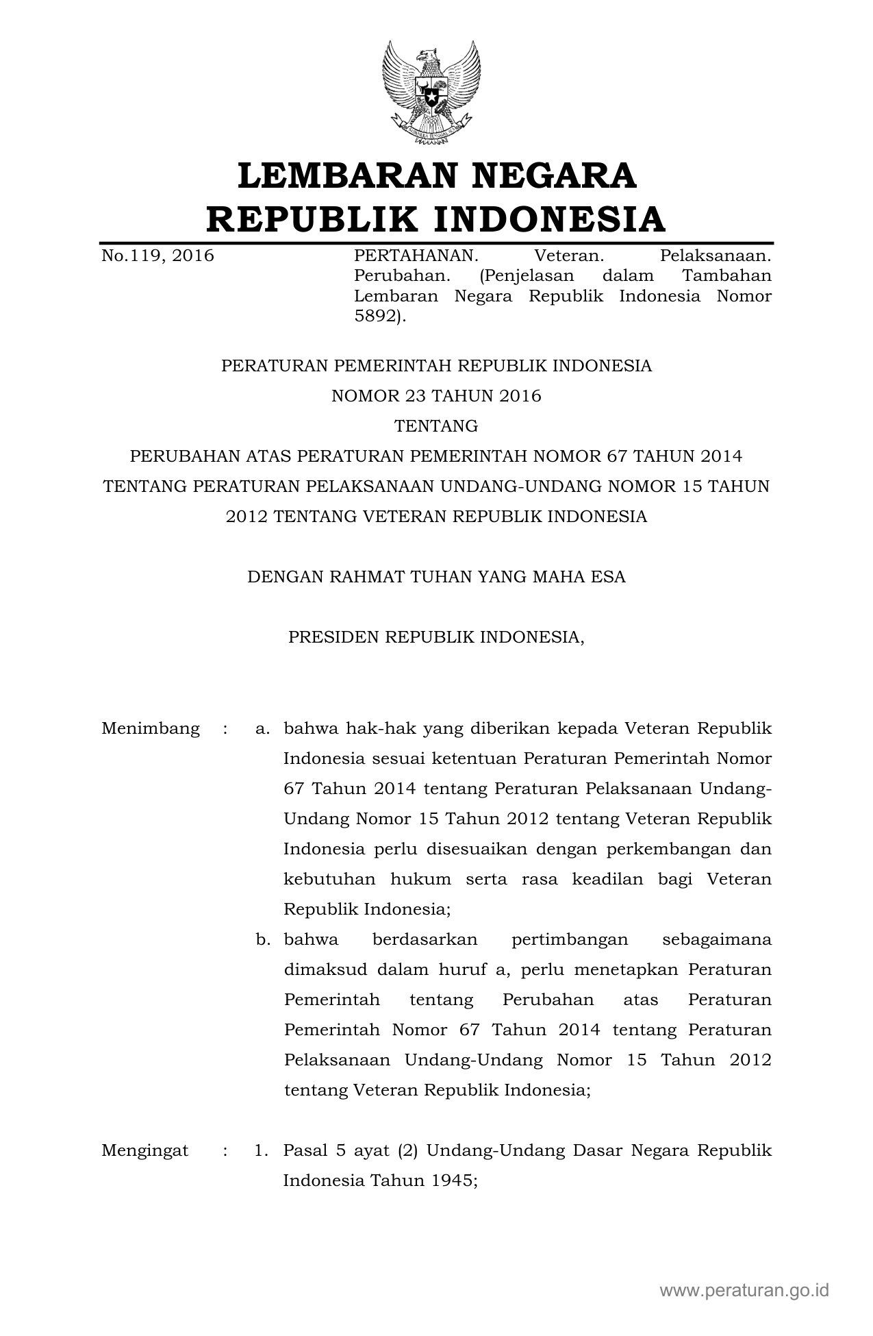 PP Nomor 23 Tahun 2016 | Peraturan Pemerintah Nomor 23 Tahun 2016 tentang PERUBAHAN ATAS PERATURAN PEMERINTAH NOMOR 67 TAHUN 2014 TENTANG PERATURAN PELAKSANAAN UNDANGUNDANG NOMOR 15 TAHUN 2012 TENTANG VETERAN REPUBLIK INDONESIA