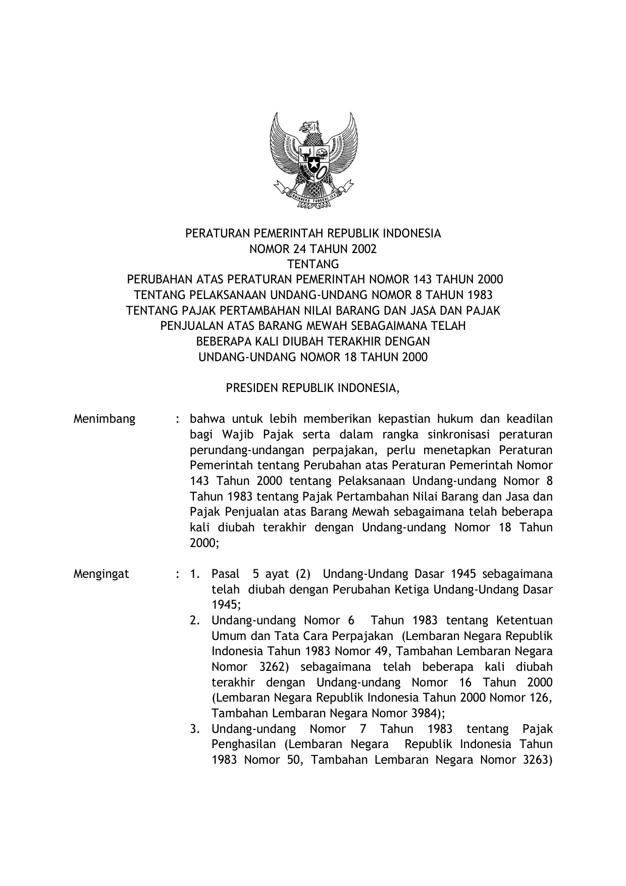 PP Nomor 24 Tahun 2002 | Peraturan Pemerintah Nomor 24 Tahun 2002 tentang PERUBAHAN PP 143-2000 TENTANG PELAKSANAAN UU 8-1983 TENTANG PAJAK PERTAMBAHAN NILAI BARANG DAN JASA DAN PAJAK PENJUALAN ATAS BARANG MEWAH SEBAGAIMANA TELAH BEBERAPA KALI DIUBAH TERAKHIR DENGAN UU 18-2000