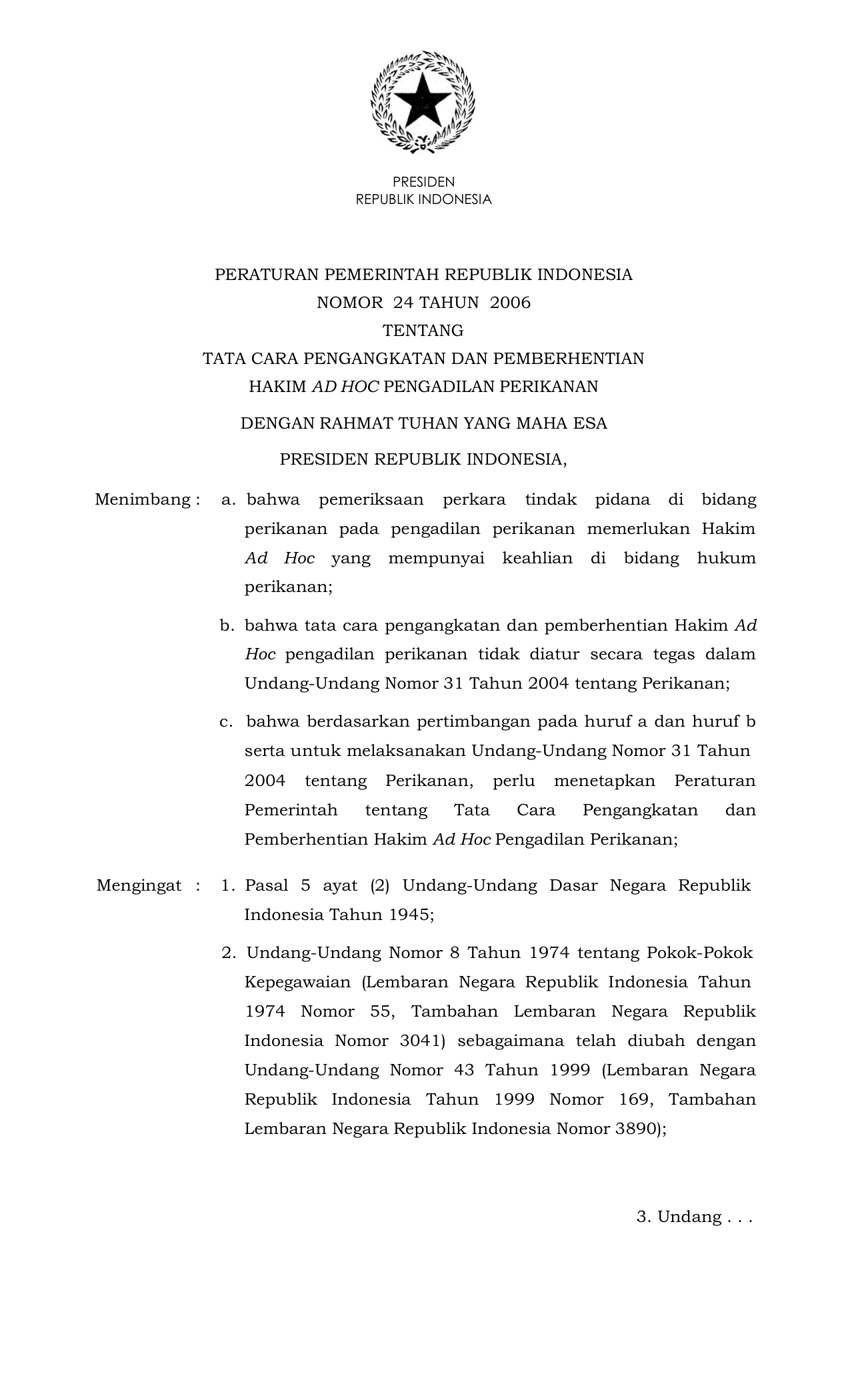 PP Nomor 24 Tahun 2006 | Peraturan Pemerintah Nomor 24 Tahun 2006 tentang TATA CARA PENGANGKATAN DAN PEMBERHENTIAN HAKIM AD HOC PENGADILAN PERIKANAN