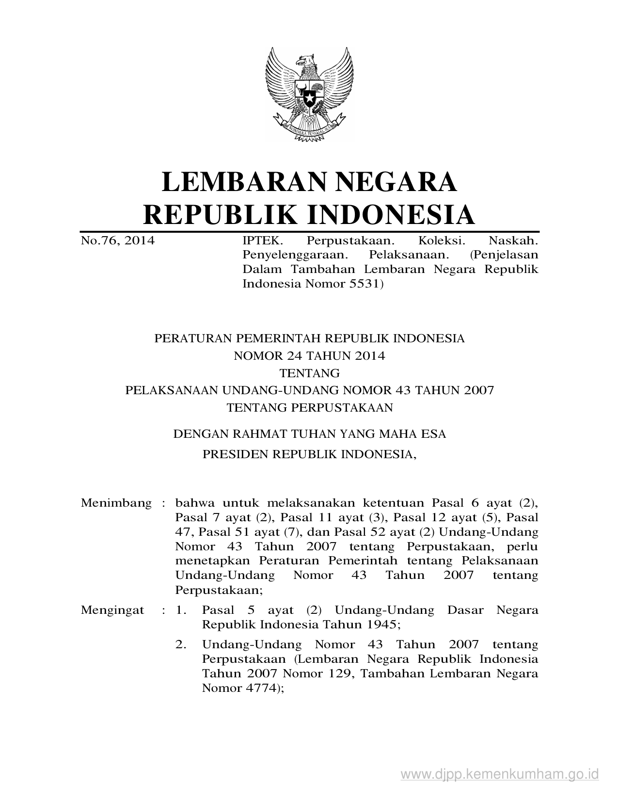 PP Nomor 24 Tahun 2014 | Peraturan Pemerintah Nomor 24 Tahun 2014 tentang PELAKSANAAN UNDANG-UNDANG NOMOR 43 TAHUN 2007 TENTANG PERPUSTAKAAN