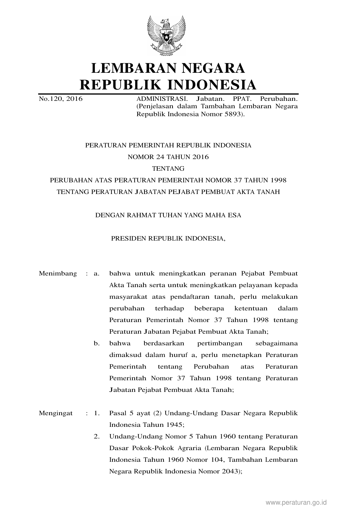 PP Nomor 24 Tahun 2016 | Peraturan Pemerintah Nomor 24 Tahun 2016 tentang PERUBAHAN ATAS PERATURAN PEMERINTAH NOMOR 37 TAHUN 1998 TENTANG PERATURAN JABATAN PEJABAT PEMBUAT AKTA TANAH