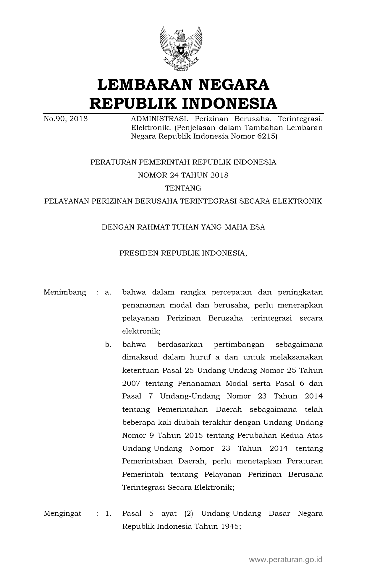 PP Nomor 24 Tahun 2018 | Peraturan Pemerintah Nomor 24 Tahun 2018 tentang Pelayanan Perizinan Berusaha Terintegrasi Secara Elektronik
