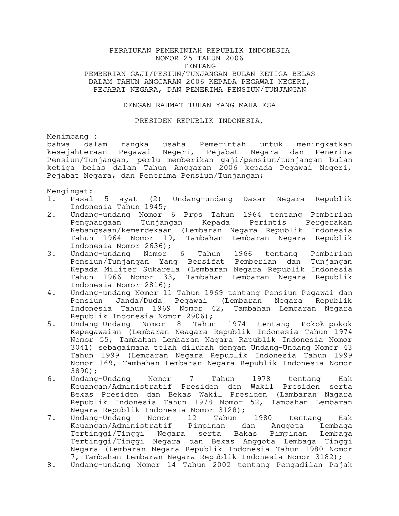 PP Nomor 25 Tahun 2006 | Peraturan Pemerintah Nomor 25 Tahun 2006 tentang PEMBERIAN GAJI/PENSIUN/TUNJANGAN BULAN KETIGA BELAS DALAM TAHUN ANGGARAN 2006 KEPADA PEGAWAI NEGERI, PEJABAT NEGARA, DAN PENERIMA PENSIUN/TUNJANGAN