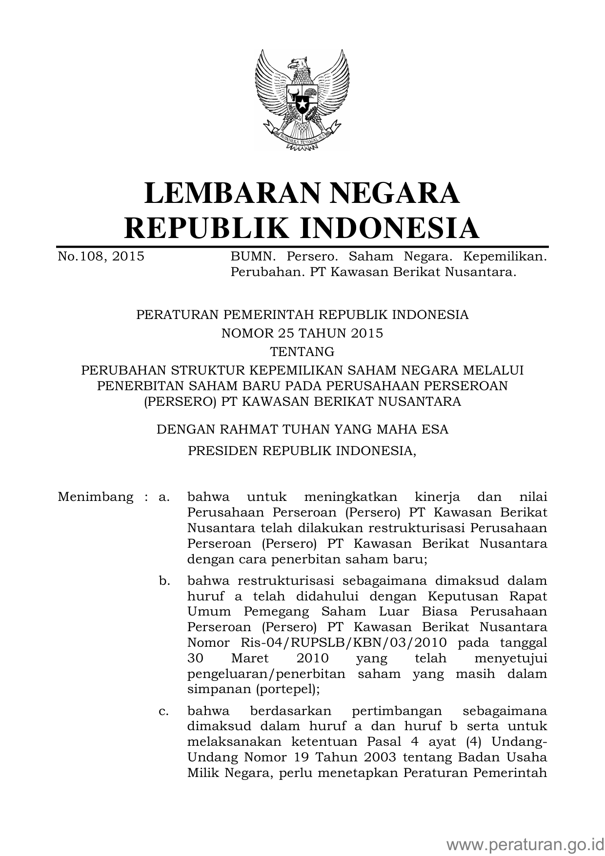 PP Nomor 25 Tahun 2015 | Peraturan Pemerintah Nomor 25 Tahun 2015 tentang PERUBAHAN STRUKTUR KEPEMILIKAN SAHAM NEGARA MELALUI PENERBITAN SAHAM BARU PADA PERUSAHAAN PERSEROAN (PERSERO) PT KAWASAN BERIKAT NUSANTARA