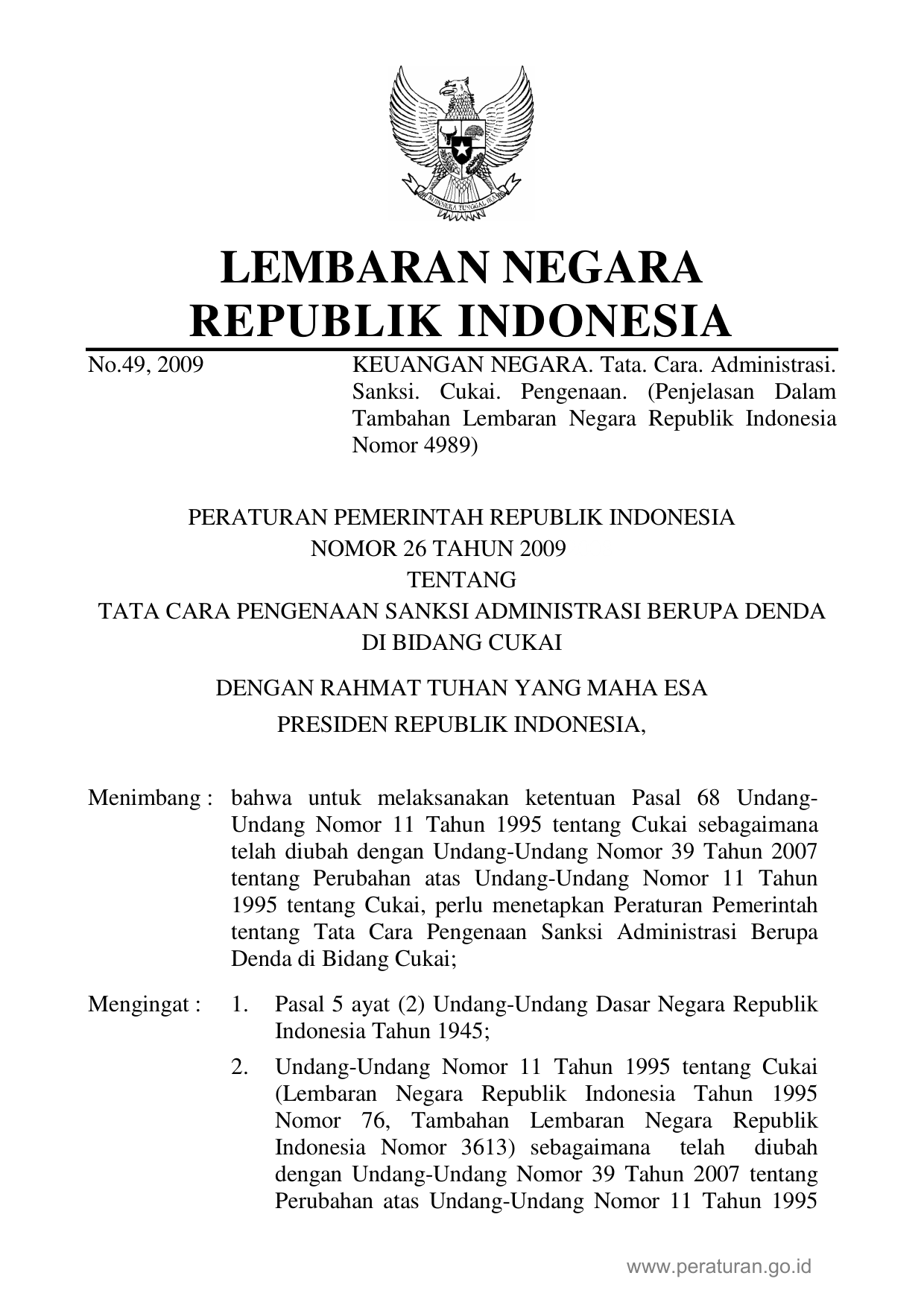 PP Nomor 26 Tahun 2009 | Peraturan Pemerintah Nomor 26 Tahun 2009 tentang Tata Cara Pengenaan Sanksi Administrasi Berupa Denda di Bidang Cukai