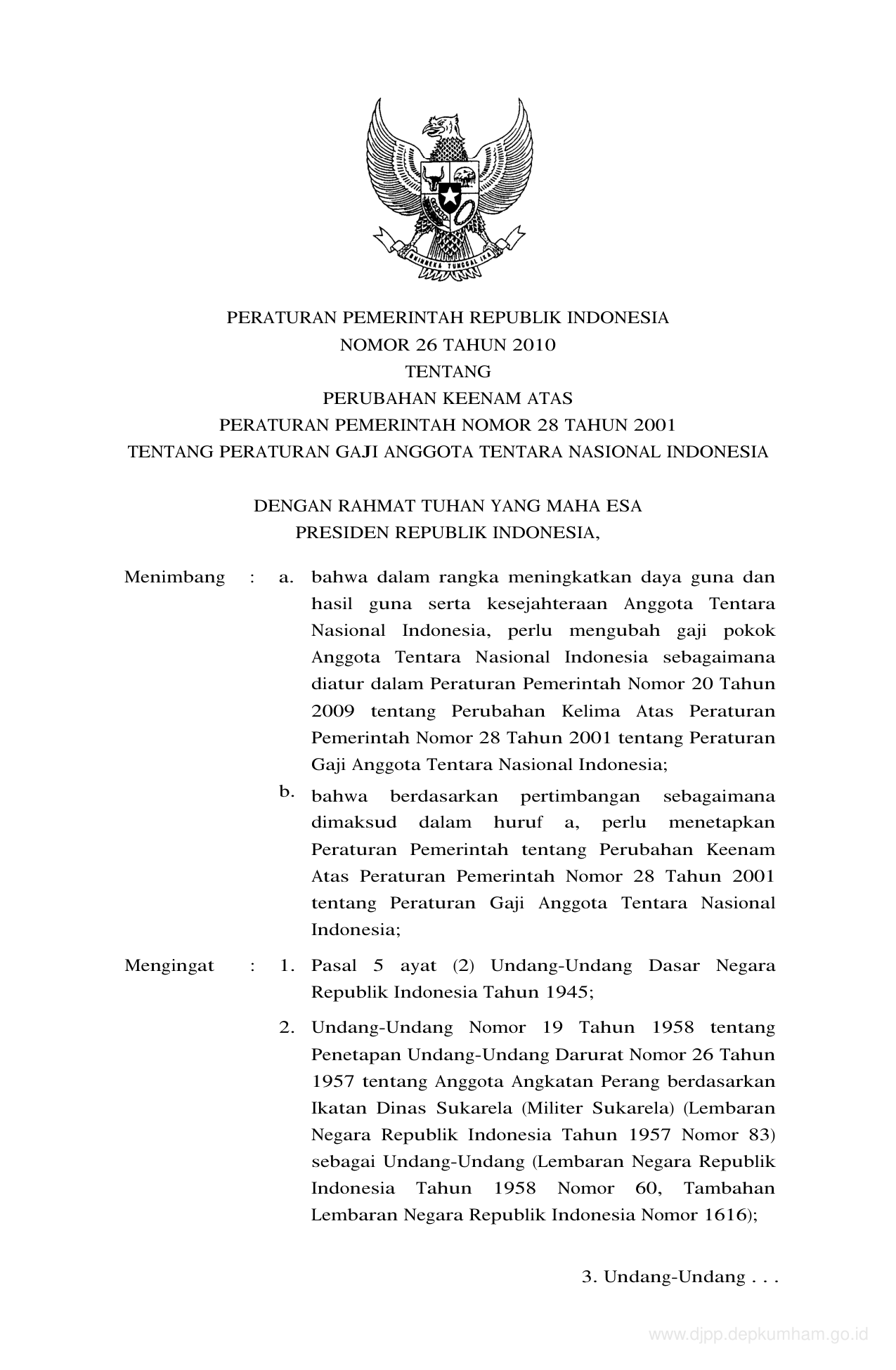 PP Nomor 26 Tahun 2010 | Peraturan Pemerintah Nomor 26 Tahun 2010 tentang PERUBAHAN KEENAM ATAS PERATURAN PEMERINTAH NOMOR 28 TAHUN 2001 TENTANG PERATURAN GAJI TENTARA NASIONAL INDONESIA