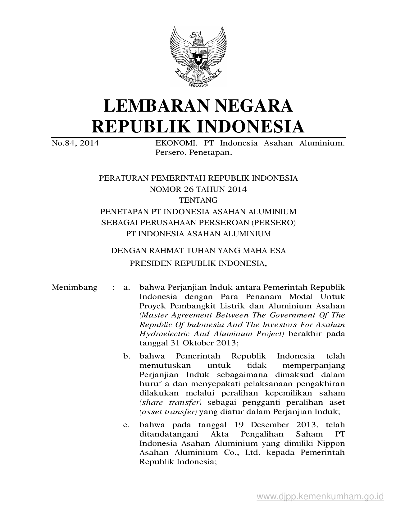 PP Nomor 26 Tahun 2014 | Peraturan Pemerintah Nomor 26 Tahun 2014 tentang PENETAPAN PT INDONESIA ASAHAN ALUMINIUM SEBAGAI PERUSAHAAN PERSEROAN (PERSERO) PT INDONESIA ASAHAN ALUMINIUM