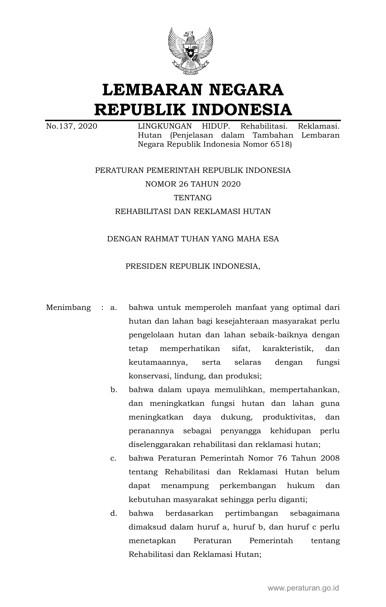 PP Nomor 26 Tahun 2020 | Peraturan Pemerintah Nomor 26 Tahun 2020 tentang REHABILITASI DAN REKLAMASI HUTAN