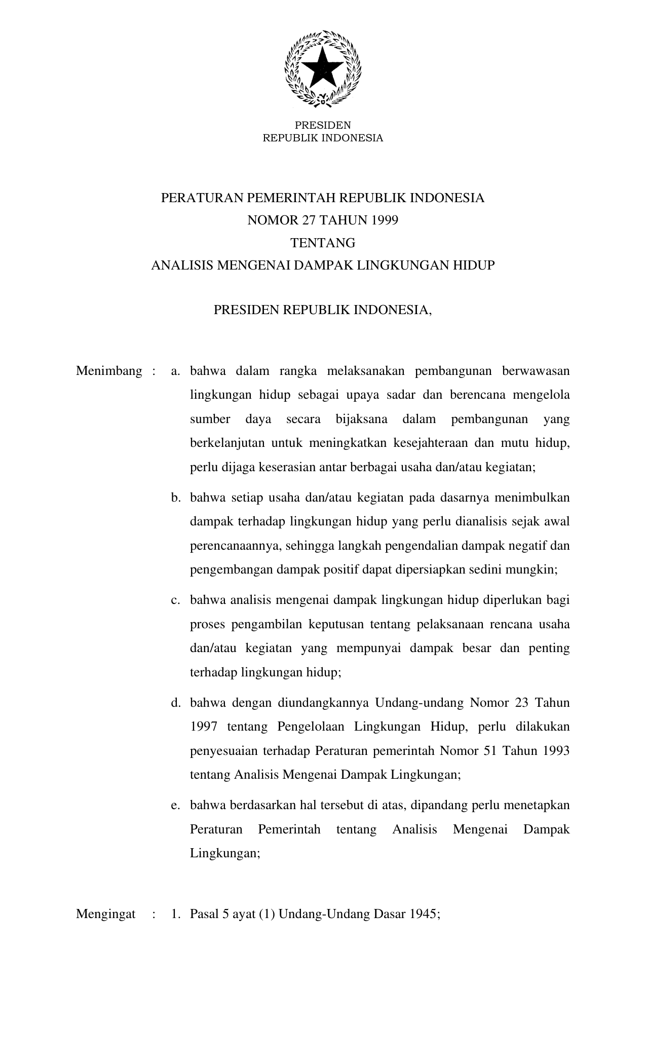 PP Nomor 27 Tahun 1999 | Peraturan Pemerintah Nomor 27 Tahun 1999 tentang ANALISIS MENGENAI DAMPAK LINGKUNGAN HIDUP