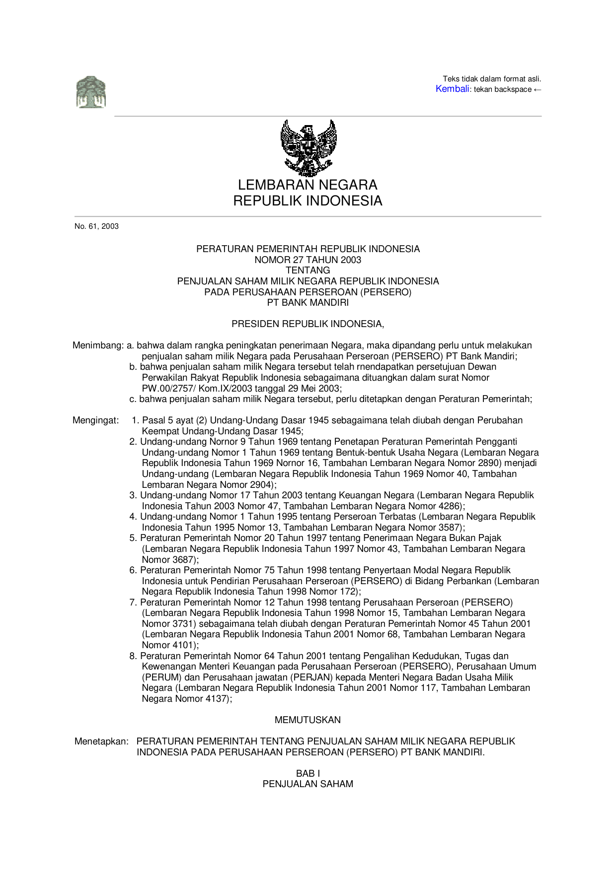 PP Nomor 27 Tahun 2003 | Peraturan Pemerintah Nomor 27 Tahun 2003 tentang PENJUALAN SAHAM MILIK NEGARA RI PADA PERUSAHAAN PERSEROAN (PERSERO) PT BANK MANDIRI