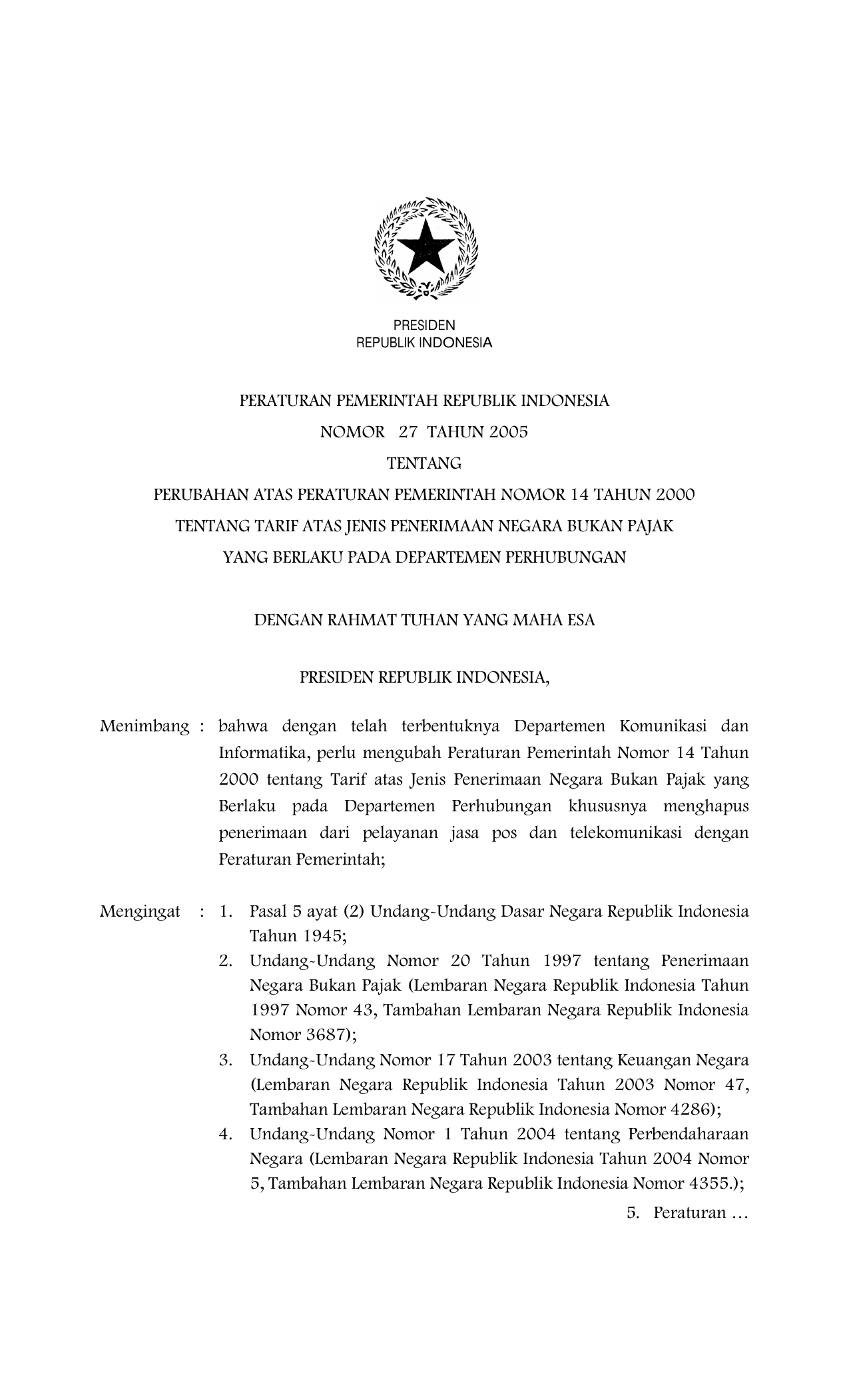 PP Nomor 27 Tahun 2005 | Peraturan Pemerintah Nomor 27 Tahun 2005 tentang PERUBAHAN PP 14-2000 TENTANG TARIF ATAS JENIS PENERIMAAN NEGARA BUKAN PAJAK YANG BERLAKU PADA DEPARTEMEN PERHUBUNGAN