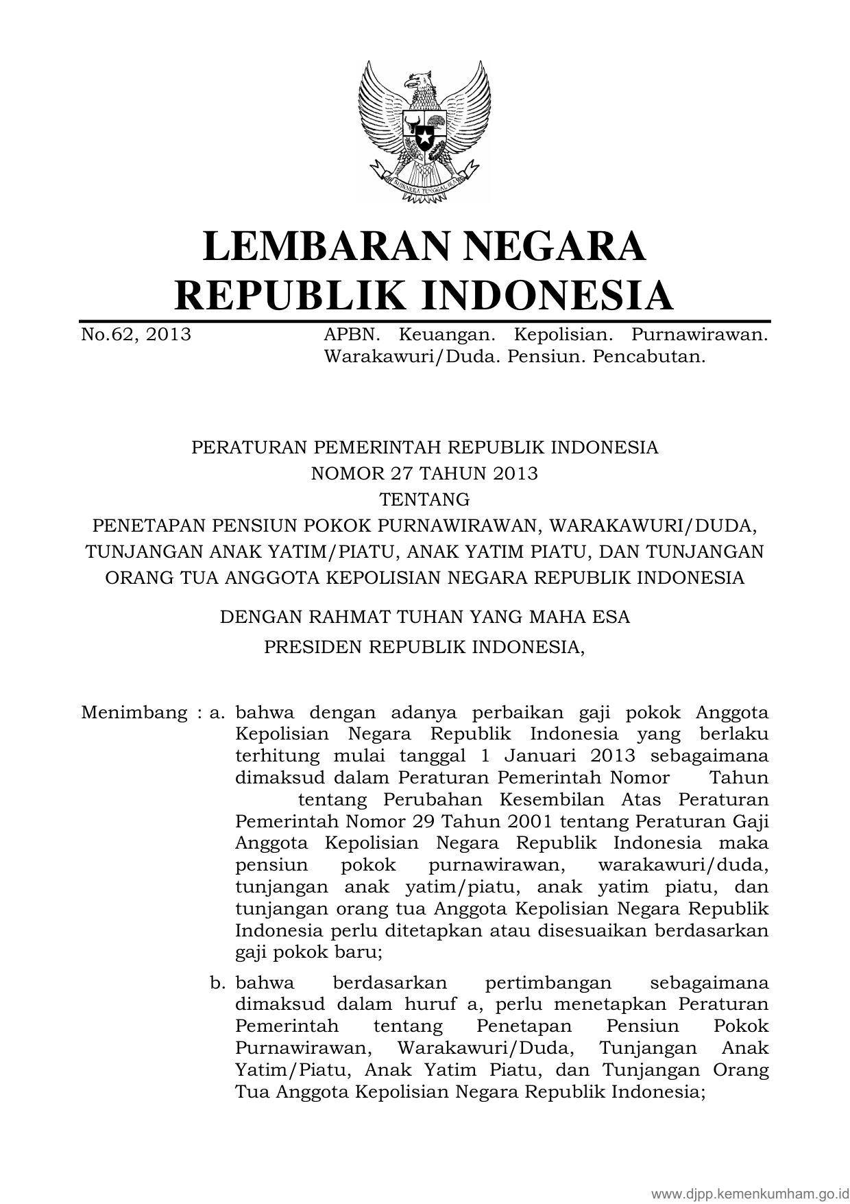 PP Nomor 27 Tahun 2013 | Peraturan Pemerintah Nomor 27 Tahun 2013 tentang PENETAPAN PENSIUN POKOK PURNAWIRAWAN, WARAKAWURI/DUDA, TUNJANGAN ANAK YATIM/PIATU, ANAK YATIM PIATU, DAN TUNJANGAN ORANG TUA ANGGOTA KEPOLISIAN