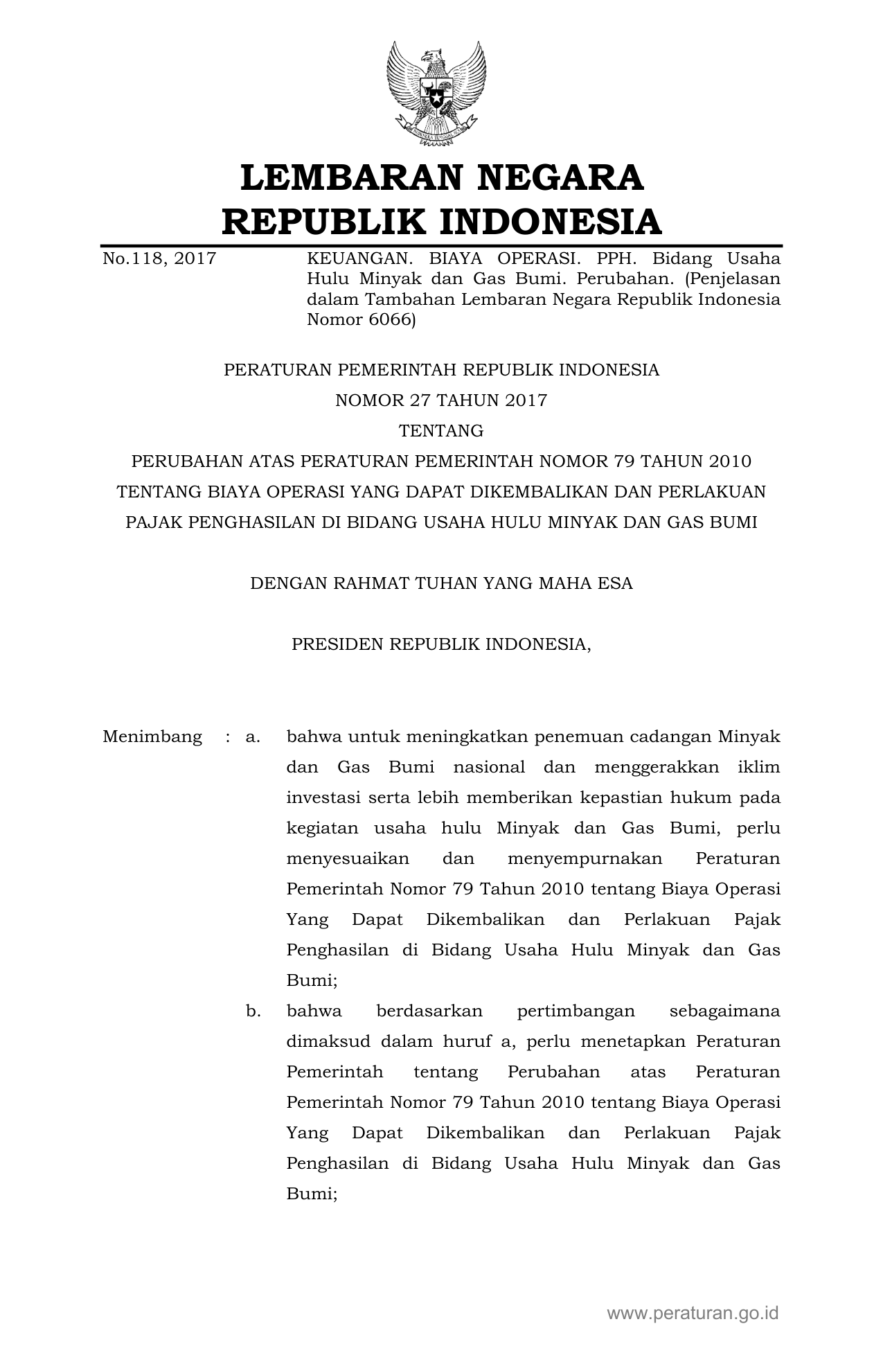 PP Nomor 27 Tahun 2017 | Peraturan Pemerintah Nomor 27 Tahun 2017 tentang Perubahan atas Peraturan Pemerintah Nomor 79 Tahun 2010 tentang Biaya Operasi yang Dapat Dikembalikan dan Perlakuan Pajak Penghasilan di Bidang Usaha Hulu Minyak dan Gas Bumi