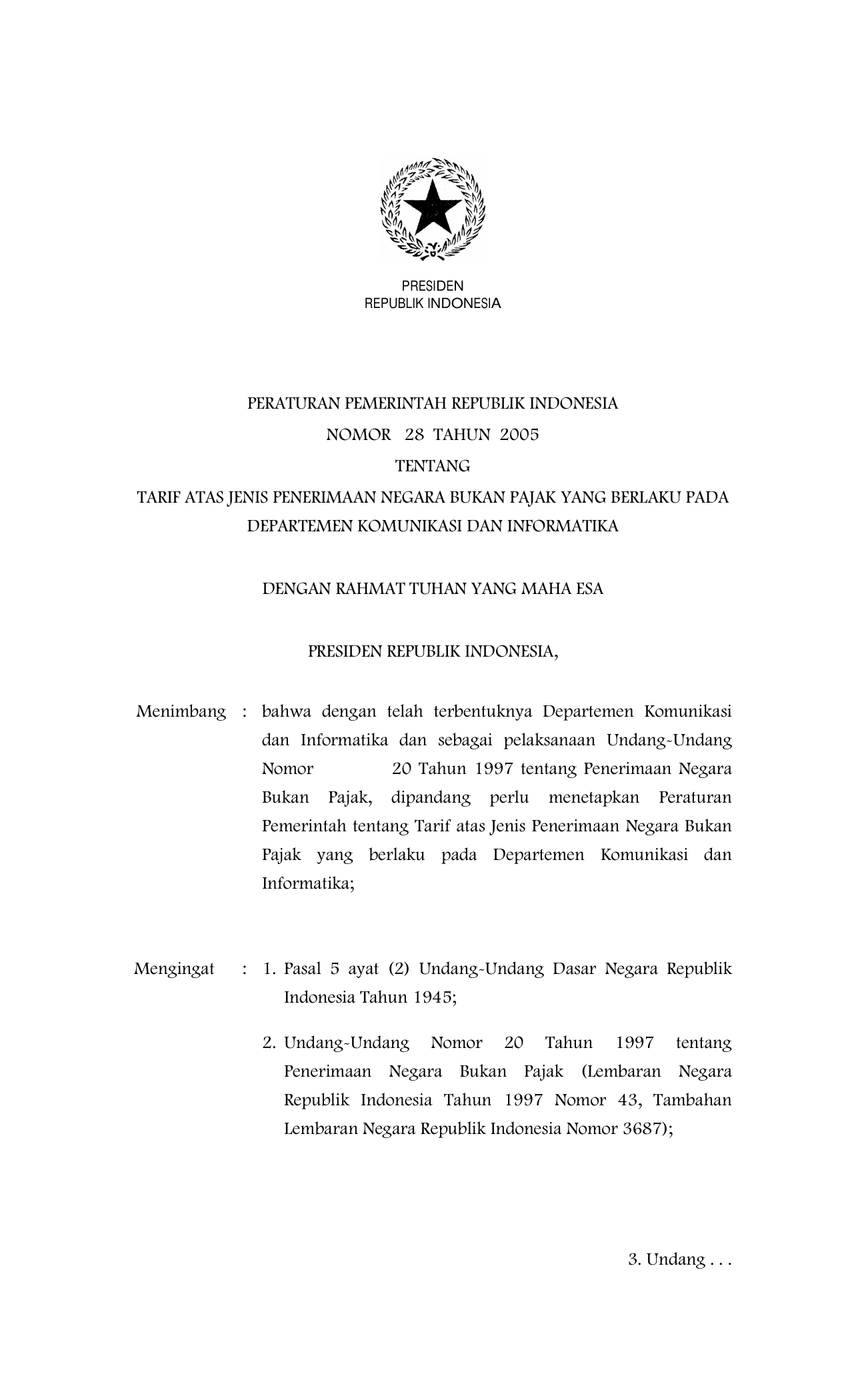 PP Nomor 28 Tahun 2005 | Peraturan Pemerintah Nomor 28 Tahun 2005 tentang TARIF ATAS JENIS PENERIMAAN NEGARA BUKAN PAJAK YANG BERLAKU PADA DEPARTEMEN KOMUNIKASI DAN INFORMASI