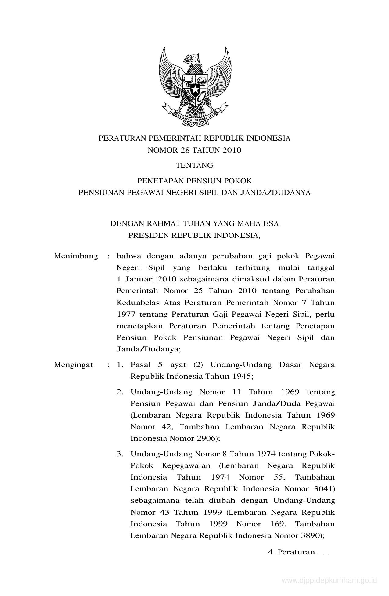 PP Nomor 28 Tahun 2010 | Peraturan Pemerintah Nomor 28 Tahun 2010 tentang PENETAPAN PENSIUN POKOK PENSIUNAN PEGAWAI NEGERI SIPIL DAN JANDA/DUDANYA