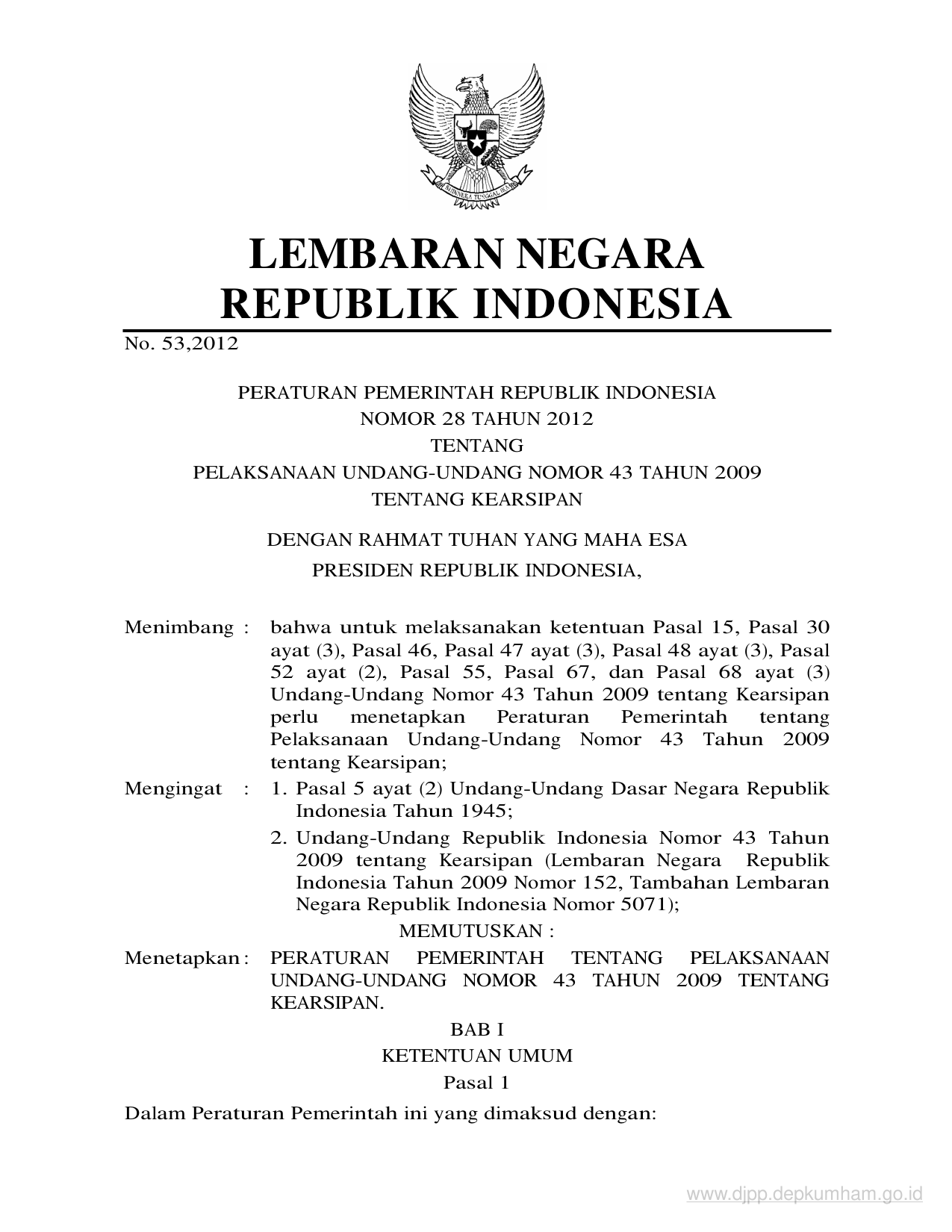 PP Nomor 28 Tahun 2012 | Peraturan Pemerintah Nomor 28 Tahun 2012 tentang PELAKSANAAN UNDANG-UNDANG NOMOR 43 TAHUN 2009 TENTANG KEARSIPAN