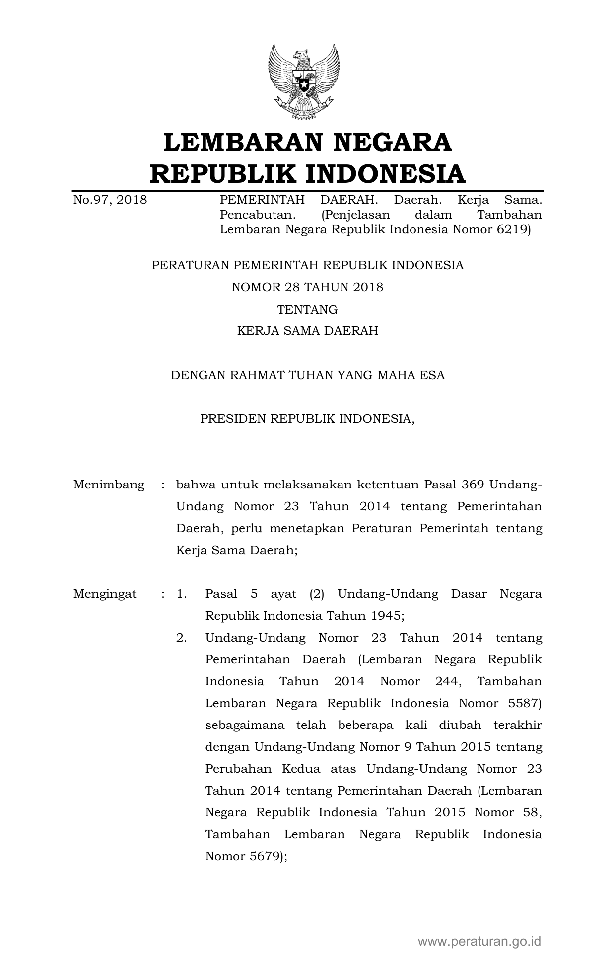 PP Nomor 28 Tahun 2018 | Peraturan Pemerintah Nomor 28 Tahun 2018 tentang Kerja Sama Daerah
