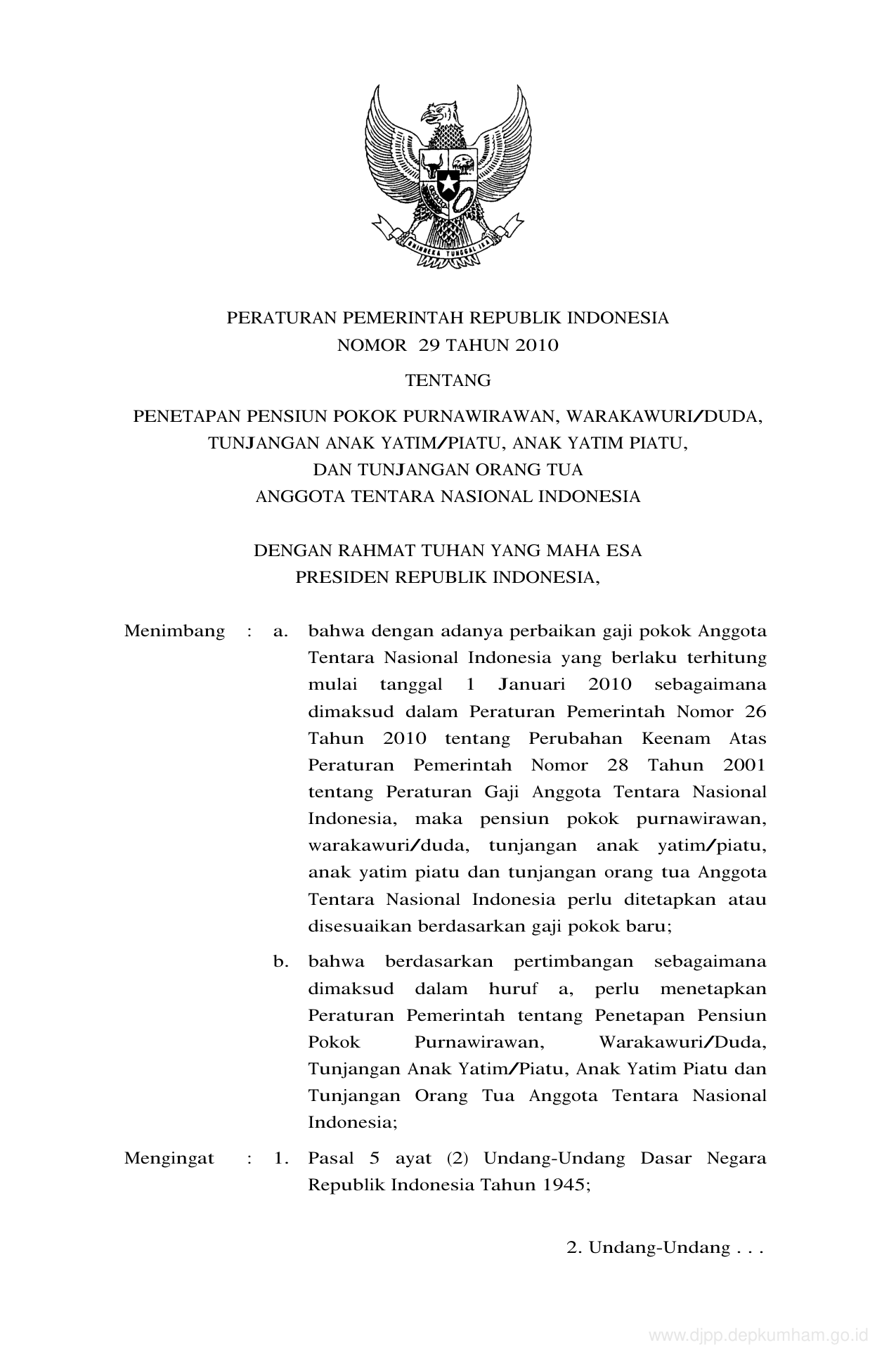 PP Nomor 29 Tahun 2010 | Peraturan Pemerintah Nomor 29 Tahun 2010 tentang PENETAPAN PENSIUN POKOK PURNAWIRAWAN, WARAKAWURI/DUDA TUNJANGAN ANAK YATIM/PIATU, ANAK YATIM PIATU DAN TUNJANGAN ORANG TUA ANGGOTA TENTARA NASIONAL INDONESIA
