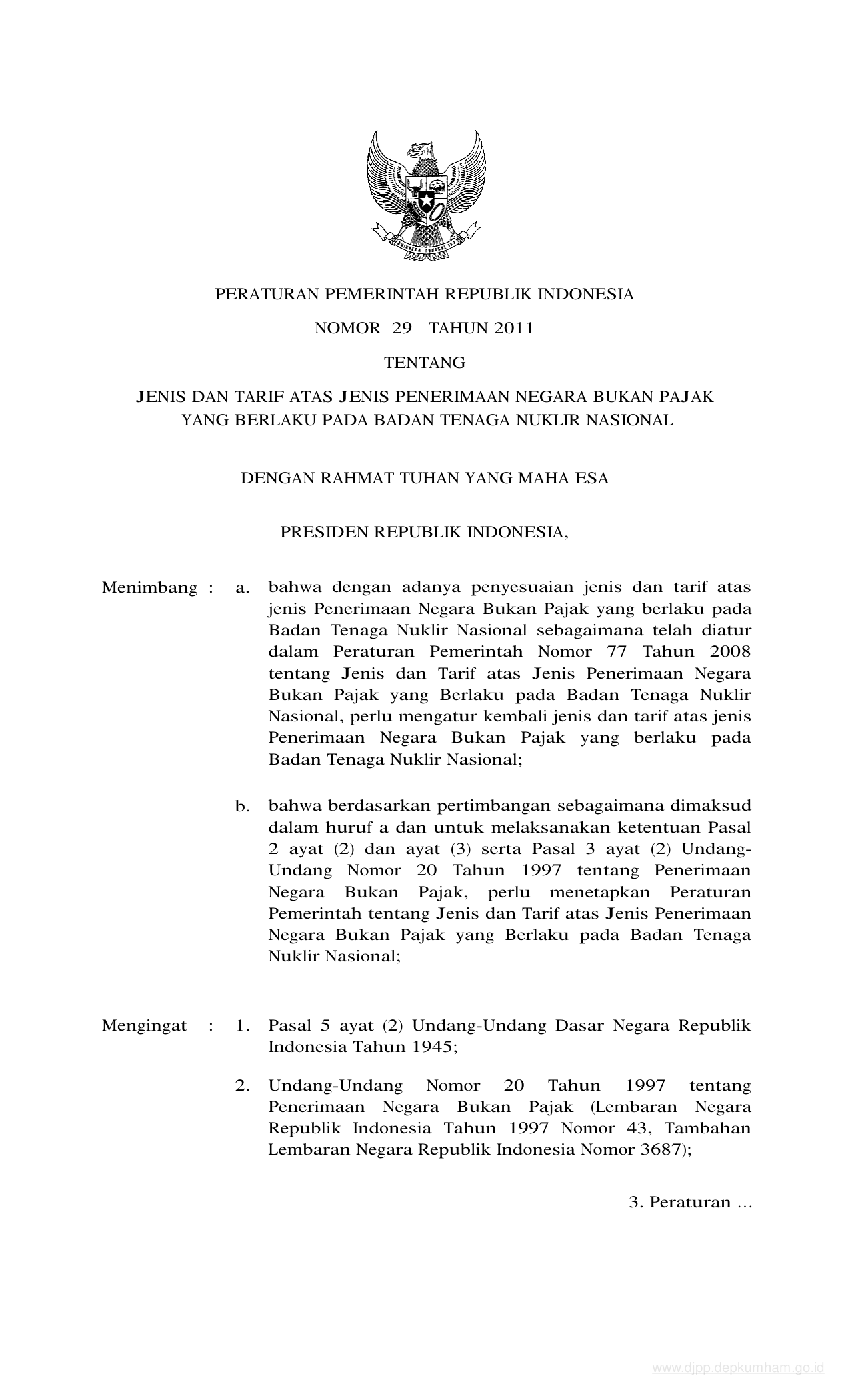PP Nomor 29 Tahun 2011 | Peraturan Pemerintah Nomor 29 Tahun 2011 tentang JENIS DAN TARIF ATAS JENIS PENERIMAAN NEGARA BUKAN PAJAK YANG BERLAKU PADA BADAN TENAGA NUKLIR NASIONAL