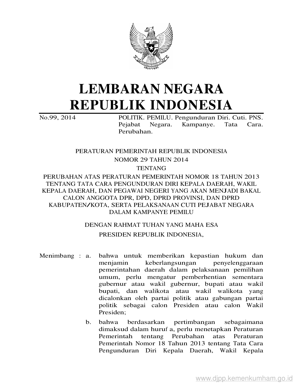PP Nomor 29 Tahun 2014 | Peraturan Pemerintah Nomor 29 Tahun 2014 tentang PERUBAHAN ATAS PERATURAN PEMERINTAH NOMOR 18 TAHUN 2013 TENTANG TATA CARA PENGUNDURAN DIRI KEPALA DAERAH, WAKIL KEPALA DAERAH, DAN PEGAWAI NEGERI YANG AKAN MENJADI BAKAL CALON ANGGOTA DPR, DPD, DPRD PROVINSI, DAN DPRD KABUPATEN/KOTA, SERTA PELAKSANAAN CUT