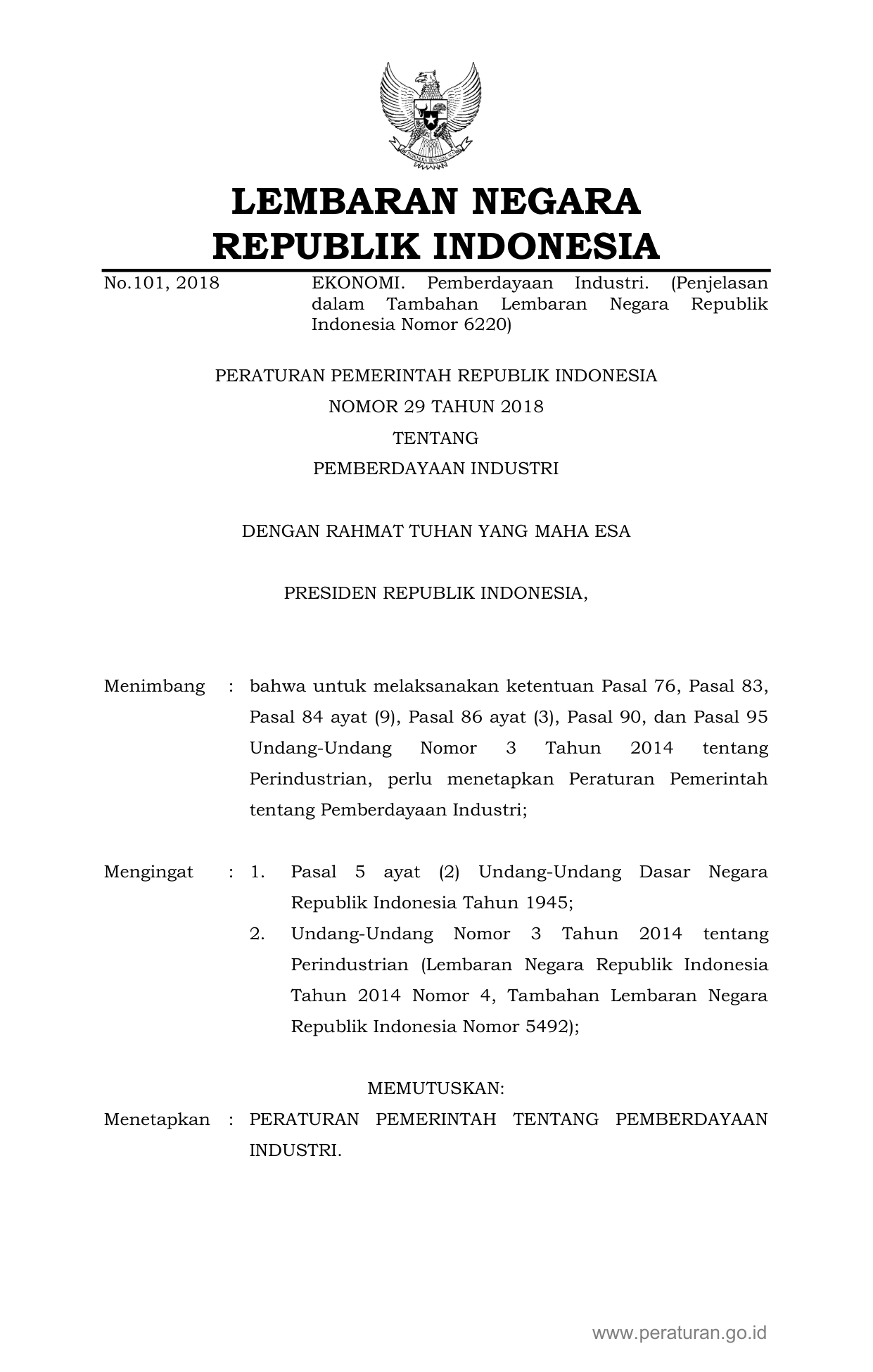PP Nomor 29 Tahun 2018 | Peraturan Pemerintah Nomor 29 Tahun 2018 tentang Pemberdayaan Industri