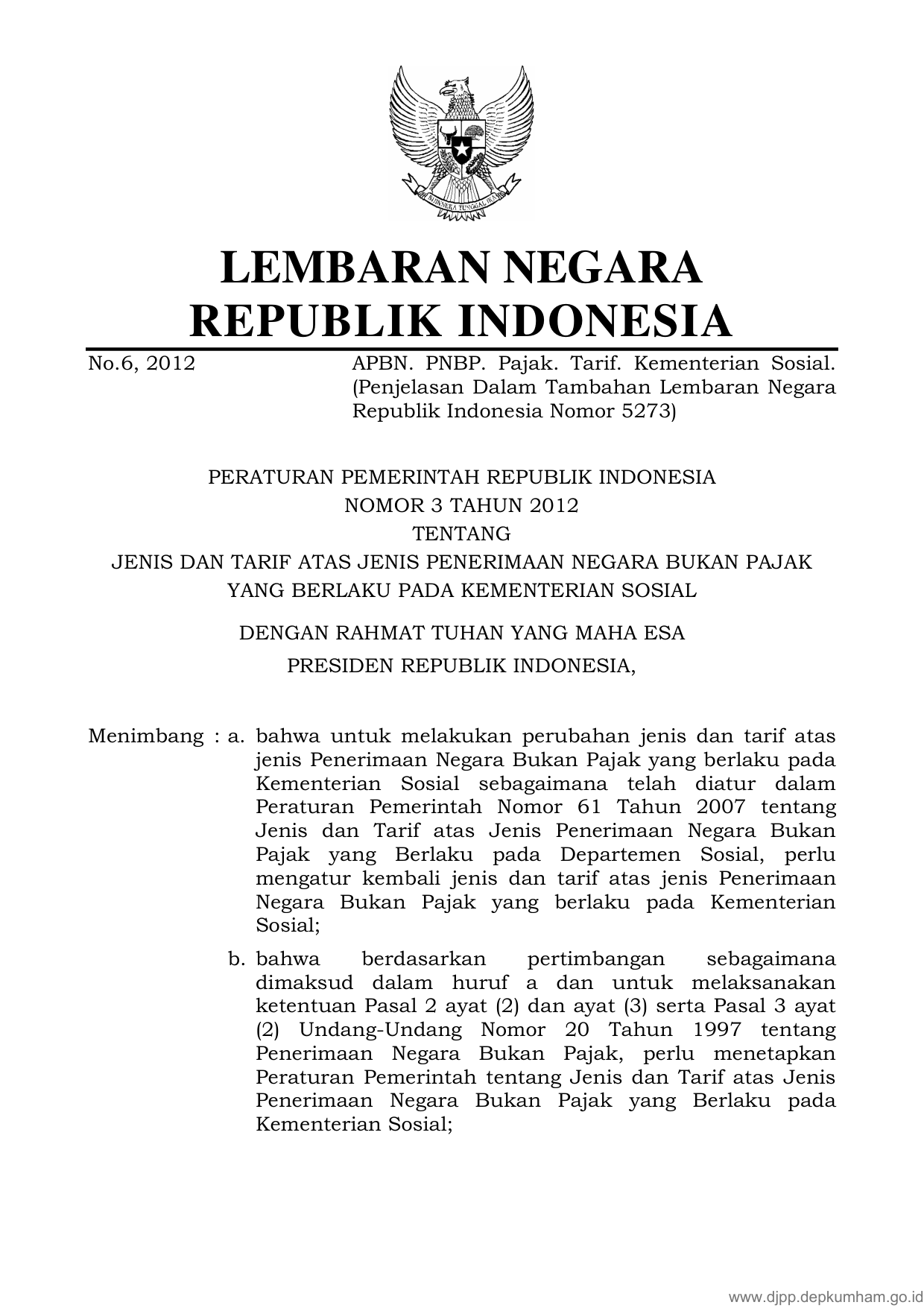 PP Nomor 3 Tahun 2012 | Peraturan Pemerintah Nomor 3 Tahun 2012 tentang JENIS DAN TARIF ATAS JENIS PENERIMAAN NEGARA BUKAN PAJAK YANG BERLAKU PADA KEMENTERIAN SOSIAL