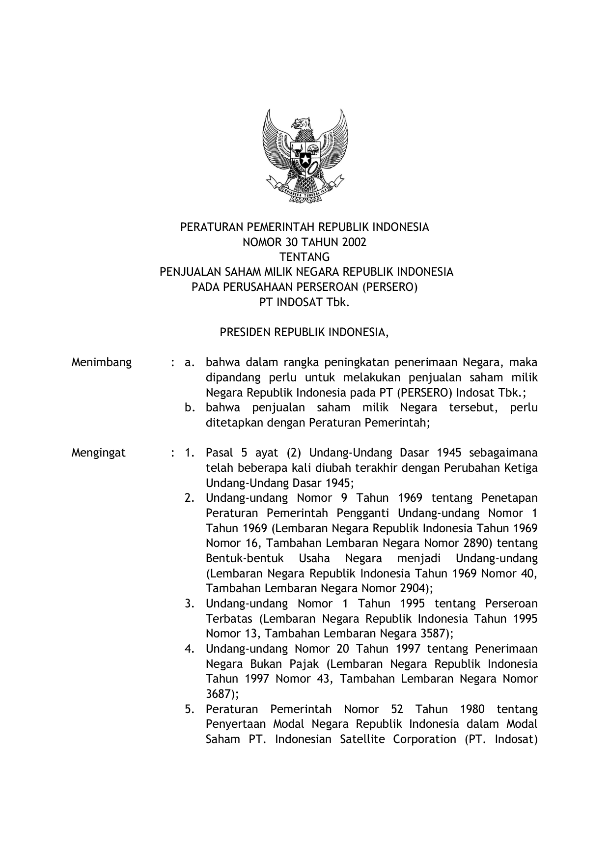 PP Nomor 30 Tahun 2002 | Peraturan Pemerintah Nomor 30 Tahun 2002 tentang PENJUALAN SAHAM MILIK NEGARA RI PADA PERUSAHAAN PERSEROAN (PERSERO) PT INDOSAT TBK
