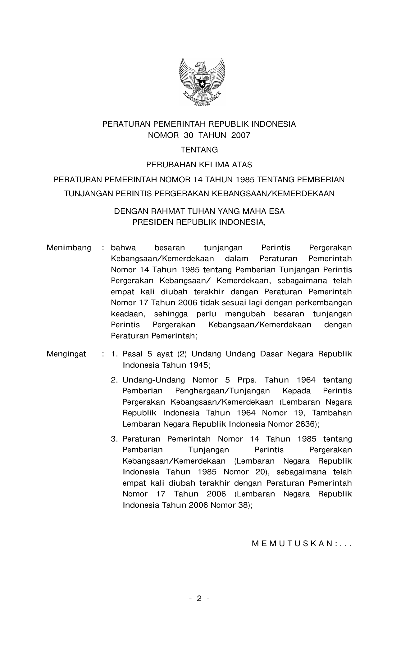 PP Nomor 30 Tahun 2007 | Peraturan Pemerintah Nomor 30 Tahun 2007 tentang PERUBAHAN KELIMA PP 14-1985 TENTANG PEMBERIAN TUNJANGAN PERINTIS PERGERAKAN KEBANGSAAN/KEMERDEKAAN