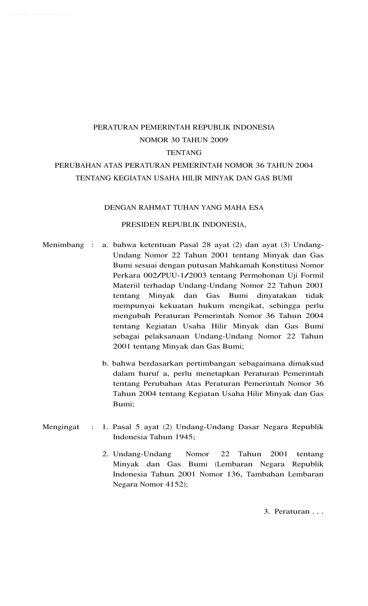 PP Nomor 30 Tahun 2009 | Peraturan Pemerintah Nomor 30 Tahun 2009 tentang PERUBAHAN PP 36-2004 TENTANG KEGIATAN USAHA HILIR MINYAK DAN GAS BUMI